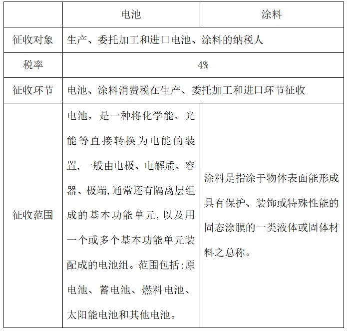 自2015年2月1日起,将电池、涂料列入消费税征收范围,在生产、委托加工和进口环节征收,适用税率均为4%。