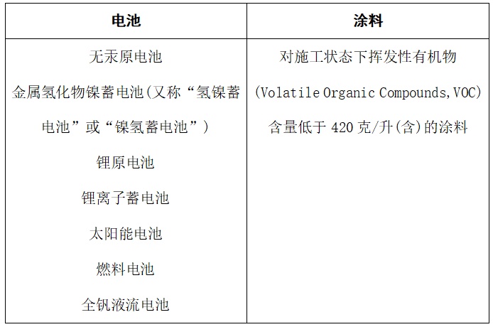 对无汞原电池、金属氢化物镍蓄电池(又称“氢镍蓄电池”或“镍氢蓄电池”)、锂原电池、锂离子蓄电池、太阳能电池、燃料电池和全钒液流电池免征消费税。