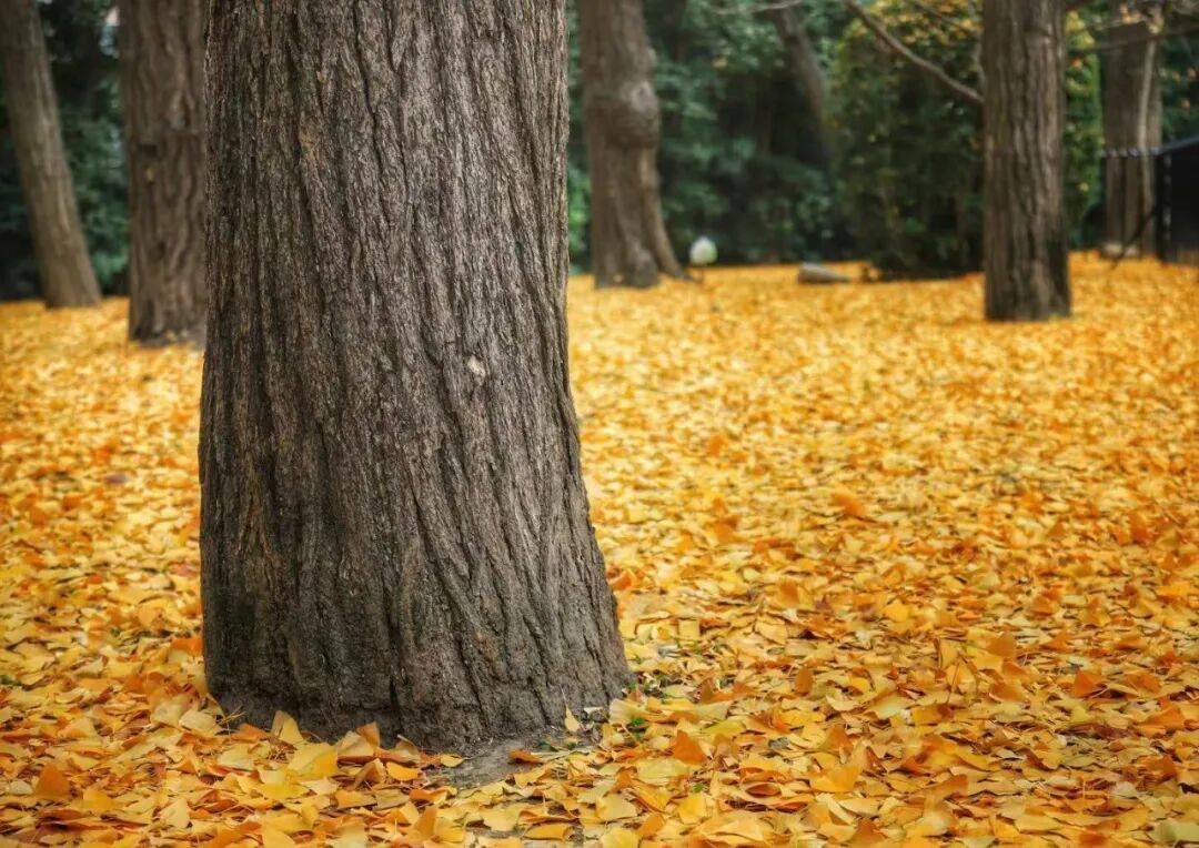 近日的持续低温,不仅染黄了银杏枝头,还催落了片片金叶,在街巷与绿地间铺就了一层厚厚的“金黄地毯“。
