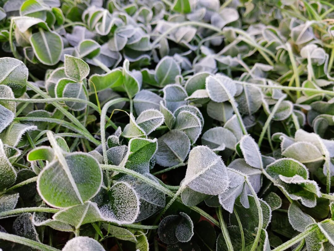 昨天(14日)17时50分闵行预警发布中心发布了霜冻黄色预警信号(现已解除)。今早7点左右,在闵行大零号湾体育中心空中田径场上,绿植、玻璃上包裹着一层白茫茫的霜冻。