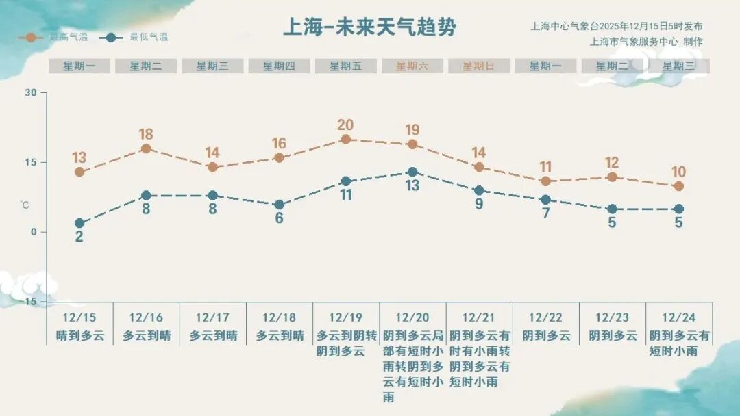此轮强冷空气对上海的影响已近尾声,气温开始回升。上海中心气象台预计,明日最高气温将升至18℃,暖似“小阳春”。周中期受弱冷空气扩散影响,最高气温略降至14~16℃。此次冷空气势力不强,周五、周六最高气温将重回20℃左右。周日前后,新一轮冷空气到来,申城将有一次弱降水过程,并伴有大风和降温。
