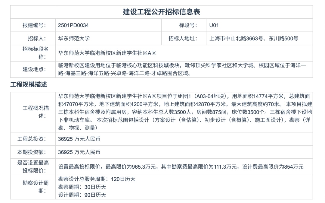 12月8日,华东师范大学官网发布临港新校区建设项目勘察设计合并招标公告。公告显示,华东师范大学临港新校区建设用地位于临港核心功能区科技城板块,毗邻顶尖科学家社区和大学城。工程总投资31.2991亿元。