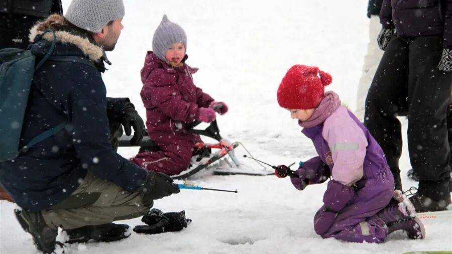 2017年2月5日,挪威奥斯陆举行冬季户外日活动,一位父亲与孩子一起冰钓。新华社记者梁有昶摄