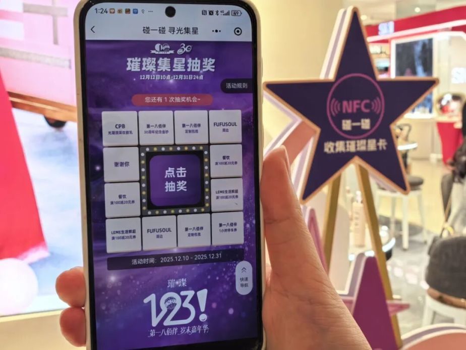 互动体验也充满了乐趣。12月13日起,30余个NFC打卡点遍布商场各处,消费者只需用手机轻轻“碰一碰”NFC感应装置,即可收集一枚虚拟“璀璨星卡”。集齐3枚星卡,便可兑换抽奖券一张,有机会获得限定金钞、品牌专属礼遇、FUFUSOUL专属周边等礼品。记者体验感受到,“集星”互动过程轻松有趣,为购物增添探索之乐。