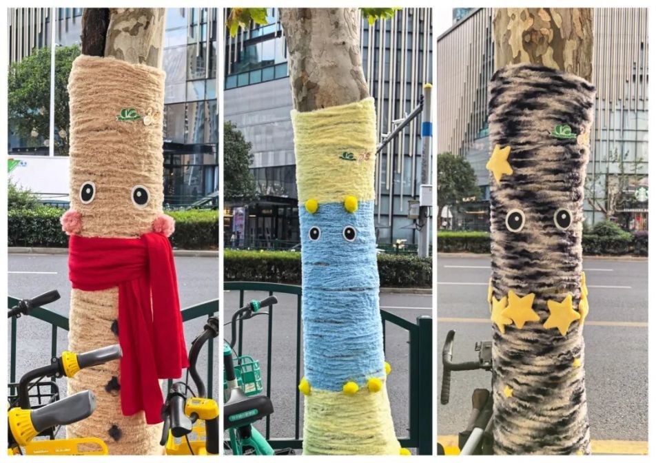张杨路一侧,行道树已悄然换上新装:一件件色彩缤纷的毛衣包裹树干,为街头点亮童话般的生机。圆溜溜的“大眼睛”点缀在树身,透着灵动的俏皮。有的树干裹着棕色毛衣,围上鲜艳的红围巾,慵懒惬意;有的“手捧”一颗硕大的爱心,格外温馨醒目;还有的披着黑白条纹和星星图案,宛如神秘的冬日访客。一件件充满巧思的“大树毛衣”,吸引行人纷纷放慢脚步。