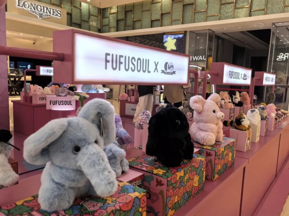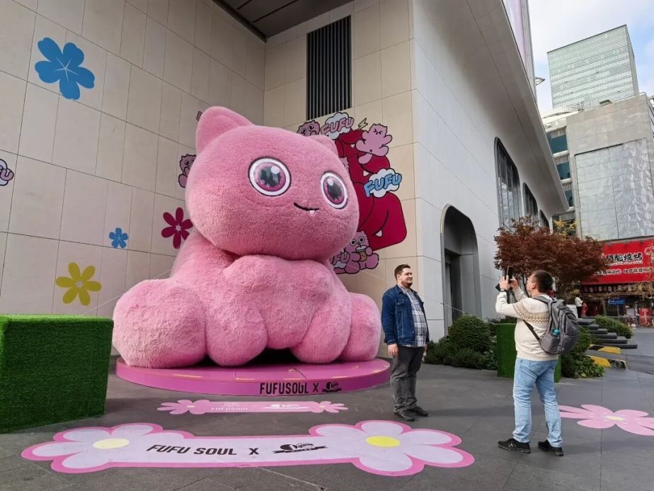 第一八佰伴还联合治愈陪伴系IP“FUFUSOUL”,打造限时主题展览与快闪店。大弯壁后,FUFU好奇地探出脑袋,仿佛在和伙伴挥手呼应。南泉北路上,5米高的巨型FUFU气模乖巧静坐,不少市民拿出手机与这只粉色的可爱玩偶合影。商场1层的快闪店,还有香氛毛绒公仔等治愈好物在售。