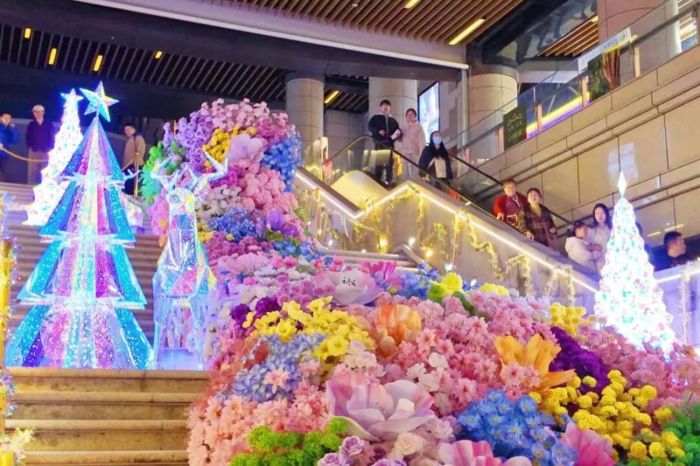 那边厢第一八佰伴正蓄势待发迎接跨年启幕,这边厢刚欢庆过11周年的长泰广场,已经拉开了温馨而热闹的跨年迎新序幕。喷泉广场旁的踏步梯,化身绚烂倾斜的花海,与近旁晶莹灵动的冰雕动植物装置相映成趣,营造独特的冬日场景。