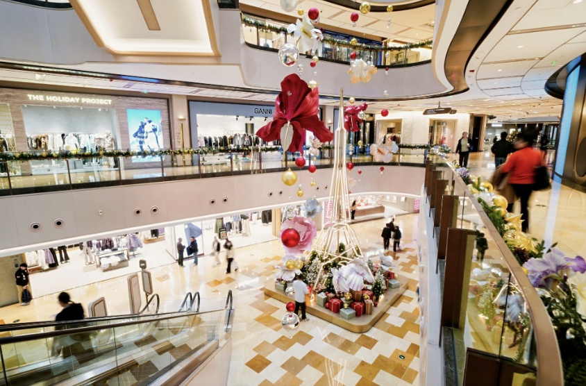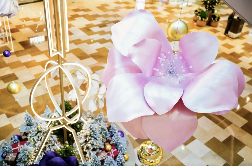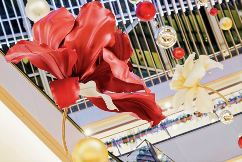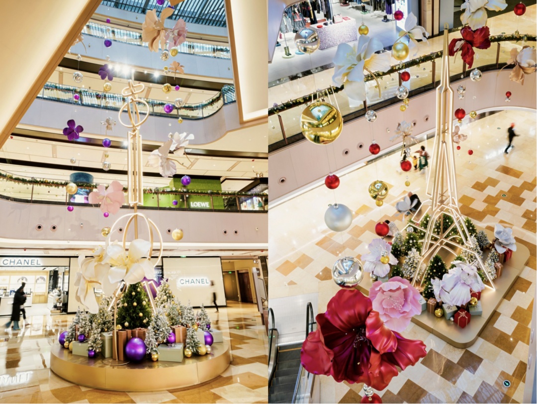 年末,走进兴业太古汇LG1中厅,以东方明珠塔与埃菲尔铁塔为原型的两座光影装置,吸引了不少消费者驻足欣赏。定睛一看,还能看到东方玉兰与法式鸢尾两种花卉装置吊坠其间,营造出跨越地域、语言与文化的诗意氛围。