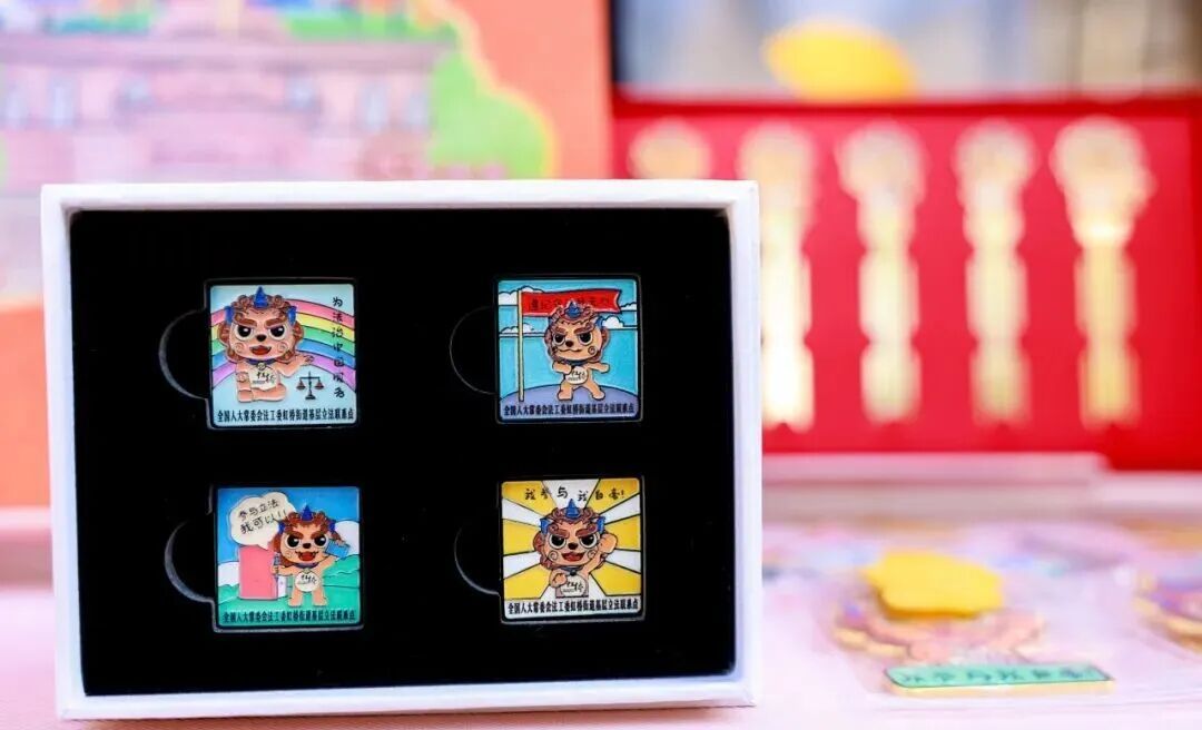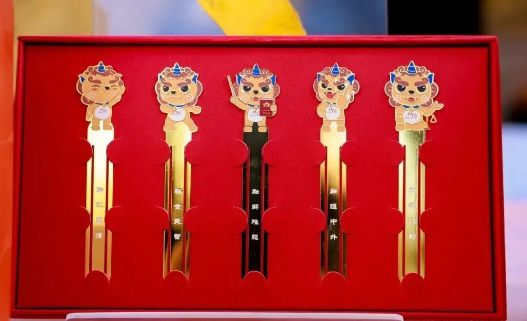展台上的獬豸主题文创更成了“流量担当”,书签、徽章、玩偶整齐陈列,季节限定款钥匙扣将银杏元素与法治象征完美结合,备受市民青睐;刻有“融汇民情”“融合民智”的书签,更将虹桥街道“五融工作法”的理念悄然传递。