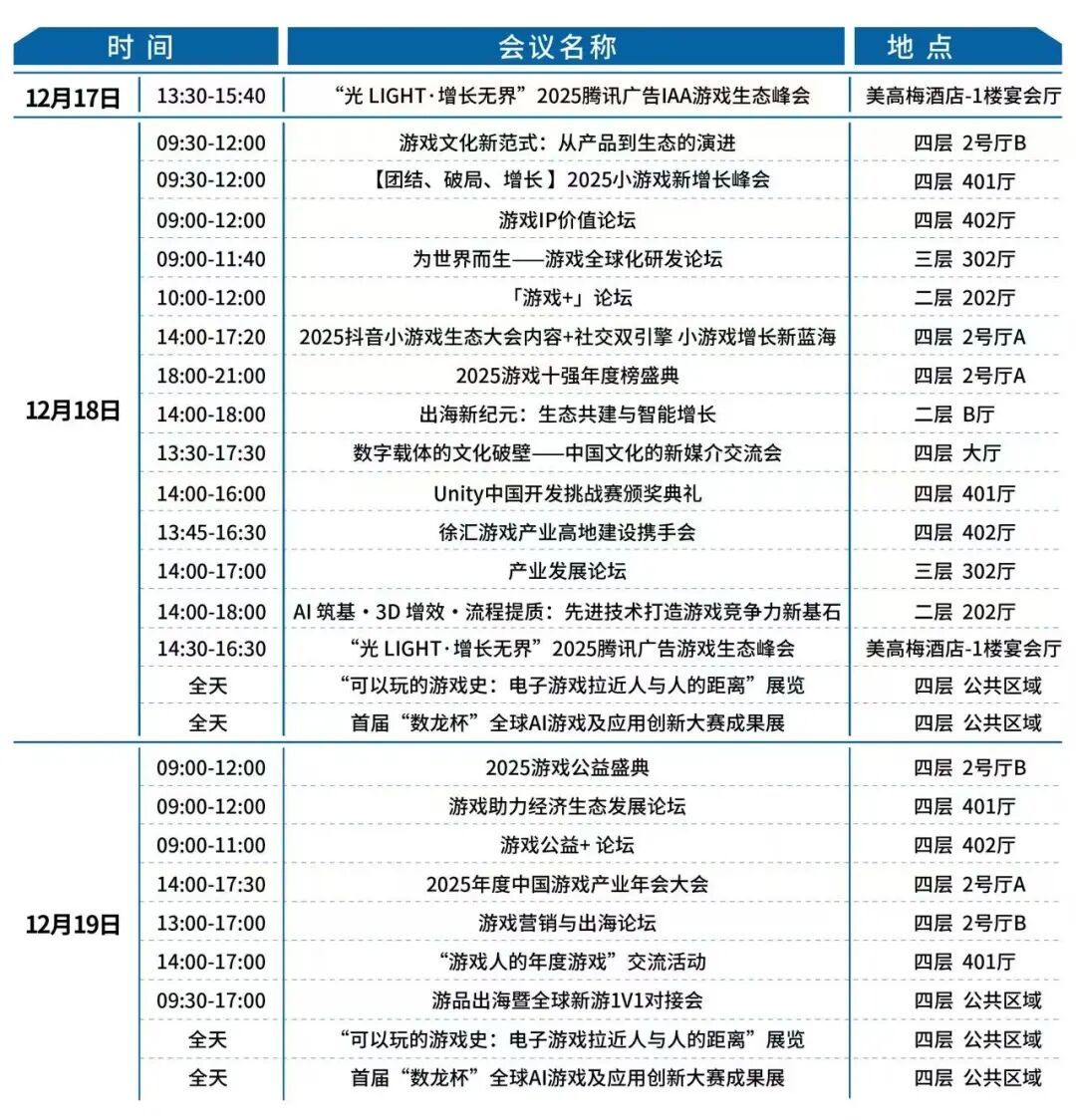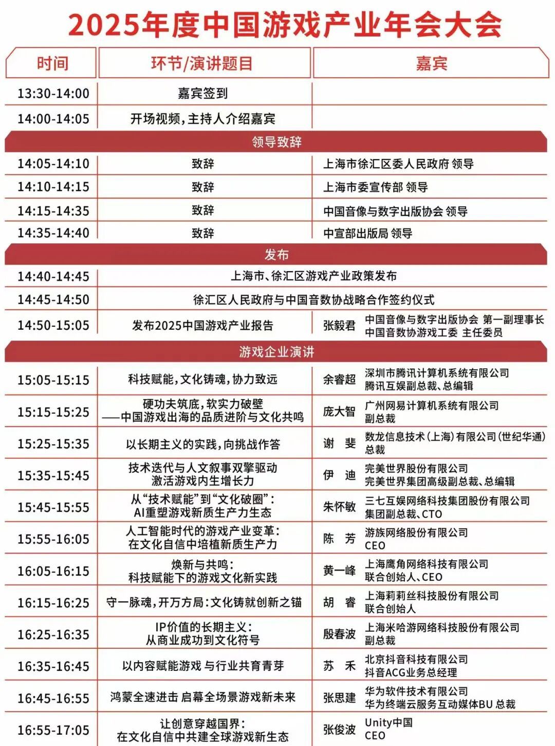 “2025年度中国游戏产业年会”将于2025年12月17日至19日在上海市徐汇区西岸国际会展中心举办。本届年会大会详细日程内容如下: