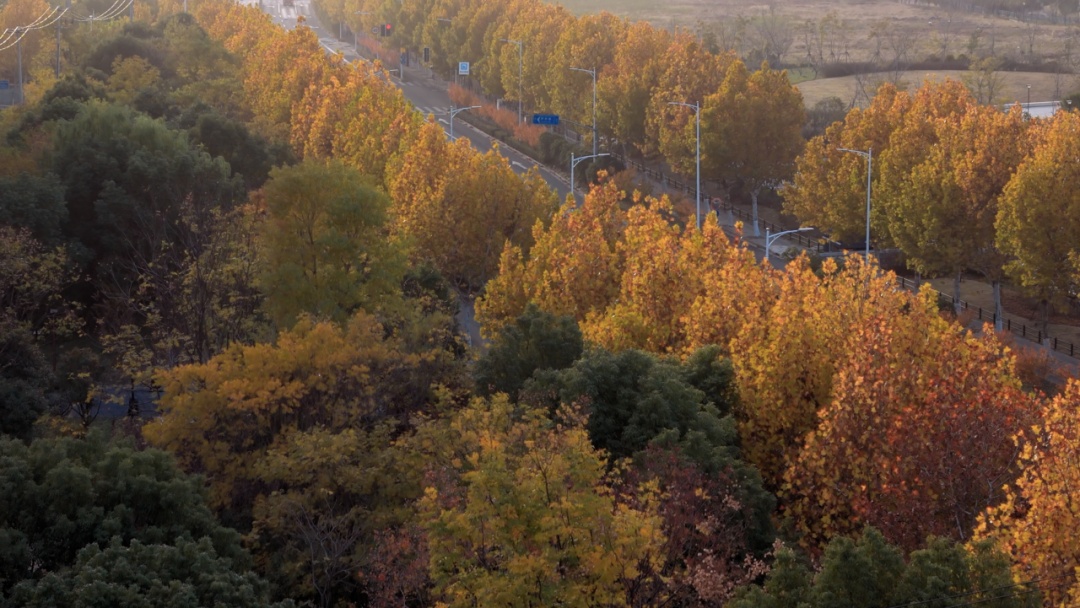霜降一过,美兰湖路的红枫便点燃整条长街,像谁把晚霞裁成千万张信笺,贴在城市胸口。