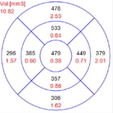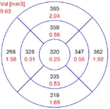 治疗前后黄斑区视网膜厚度对比:因黄斑水肿明显消退,视网膜厚度值明显降低。