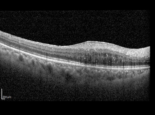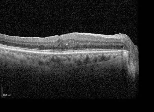 术后:前膜成功剥除,黄斑结构基本恢复平整,水肿基本消退。
