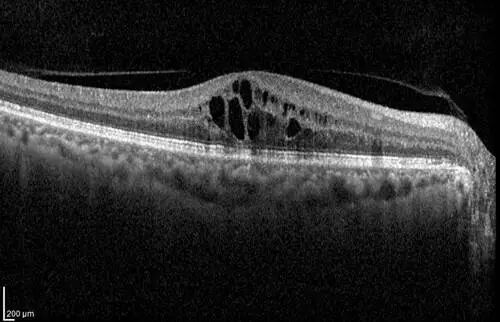 手术前:黄斑区可见牵拉性前膜,视网膜结构扭曲,伴有黄斑水肿。