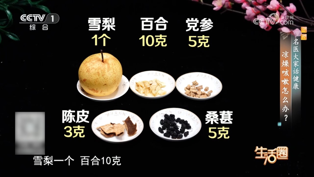 冬季天气寒冷、干燥 人体更应多补水 (每日饮水量1500~2000毫升为宜) 如果觉得喝白开水太单调 不妨试试这4杯水↓↓ 冬季天气又干又冷,燥邪、寒邪相结合,“凉燥”就会找上门。人体容易出现干咳少痰、口干、咽干、鼻干等呼吸道症状,以及皮肤干燥、大便干燥等症状。 此时,多吃一些白色食物,如雪梨、百合、银耳、莲藕、荸荠等,可以养阴润燥、生津止渴、润肺止咳。 雪梨与百合组成的雪梨百合饮具有滋阴润燥功效,能够缓解因凉燥引起的干咳、口干、咽干、鼻干、皮肤干、大便干等不适症状,尤其适合初冬饮用。 图源:央视一套 制作方法:将雪梨块、干百合10克、党参5克、陈皮3克、干桑葚5克一同放入锅中,加入适量清水,煮40分钟即可。 冬季是流感高发季,需要护好肺气、固好卫气,以增强自身抵抗力,为冬季身体健康打好坚固基础。紫苏叶有助于解表散寒、行气和胃,想要预防流感,不妨家中常备。 紫苏黄芪饮能够益气、固表、养阴、润肺,有助于提高人体免疫力,预防冬季常见的风寒感冒、流感。 图源:央视一套 制作方法:黄芪5克、紫苏叶10克、生姜10克、麦冬15克,洗净后加入适量清水,浸泡10分钟后再煮30分钟,晾至温热饮用。 小贴士:易上火人群,可以将黄芪替换为党参;3~10岁儿童,用量需减半。 冬季气温低,胃肠道对寒冷刺激较为敏感,如果防护不当,就会引发胃肠道疾病,出现腹胀、腹泻、腹痛等症状,或使原来的胃病加重。此时应健脾养胃,预防疾病发生。红香茶温中理气、燥湿和胃,不妨试试↓ 图源:央视一套 制作方法:取小茴香3~5克、红茶5克,洗净后加入适量清水,煮开后再煮3~4分钟,加适量冰糖调味即可。 小贴士:阴虚体质人群、容易上火人群不宜饮用。 冬季天气寒冷,人体血管收缩会影响肠道蠕动。此外,冬天气候干燥、空气湿度低,肠道内津液减少会使大便变得干燥。以上两点相结合,导致很多人受到凉燥便秘的困扰。如果肉类摄入多、蔬菜摄入少,还不运动,就会进一步加重便秘。 凉燥便秘的特点为大便干、排便难、腹胀、手脚冰冷、嘴巴干燥、不爱喝水、舌苔薄白。推荐温润肠道、补气血的肉苁蓉麦冬茶,缓解凉燥便秘↓↓ 图源:央视一套 制作方法:肉苁蓉10克、麦冬15克、太子参15克,洗净后加入适量清水,煮开后再煮20~25分钟。 小贴士:阴虚火旺者不宜饮用肉苁蓉麦冬茶。想要缓解凉燥便秘,还可以试试腹部按摩,促进经络气血流通,增强肠道蠕动能力↓ 图源:央视一套 动作要点:双手搓热,掌心对着肚脐,顺时针慢慢按摩腹部。