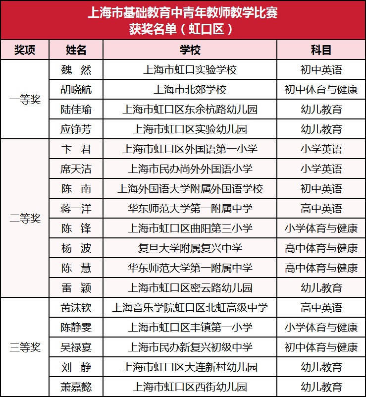 日前,2025年上海市基础教育中青年教师教学比赛结果揭晓。在这个被誉为上海基础教育界“奥运会”的比赛中,虹口区中青年教师们表现出色,取得了优异成绩,共17人获奖,其中一等奖4人,二等奖8人,三等奖5人。