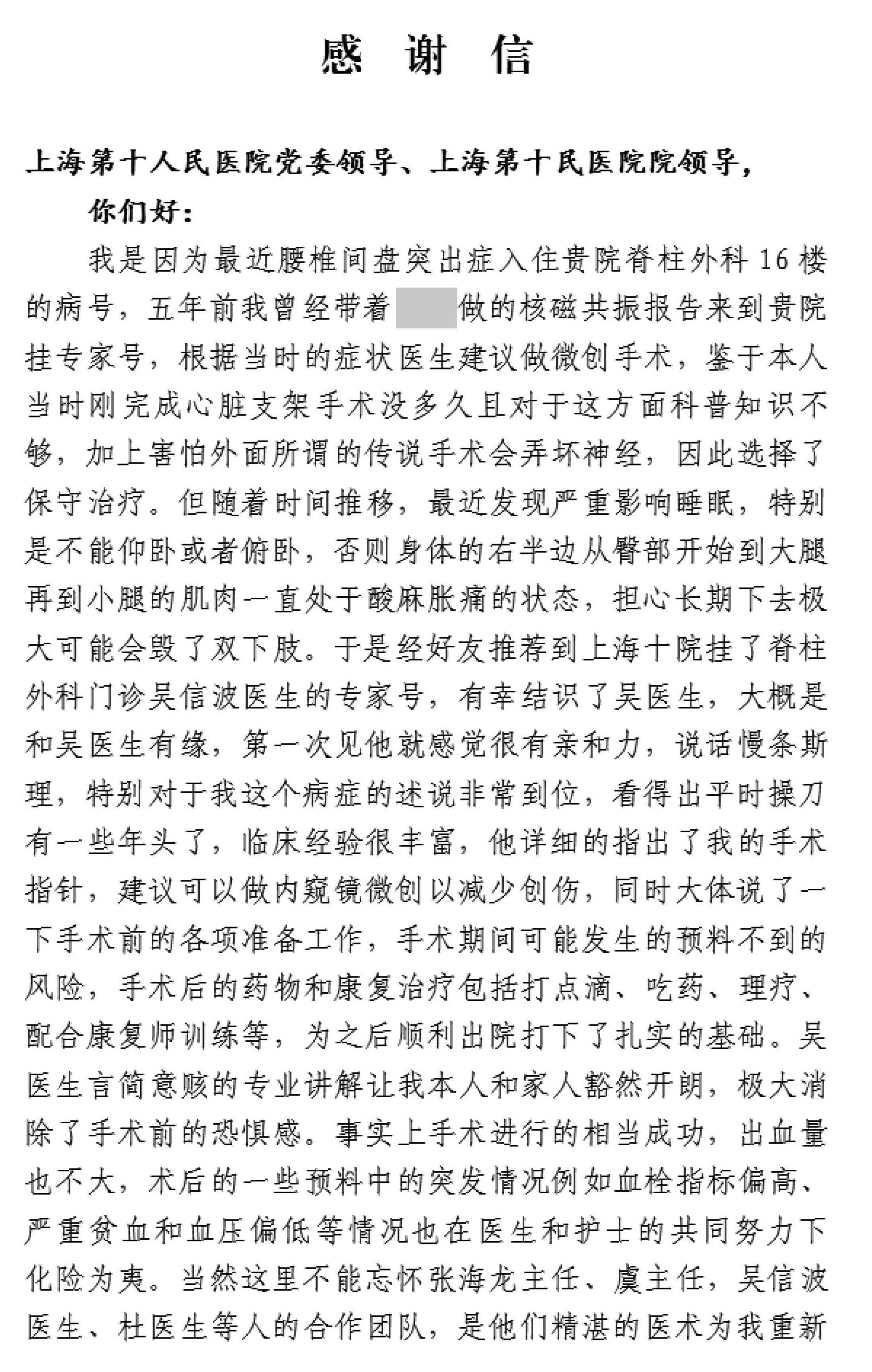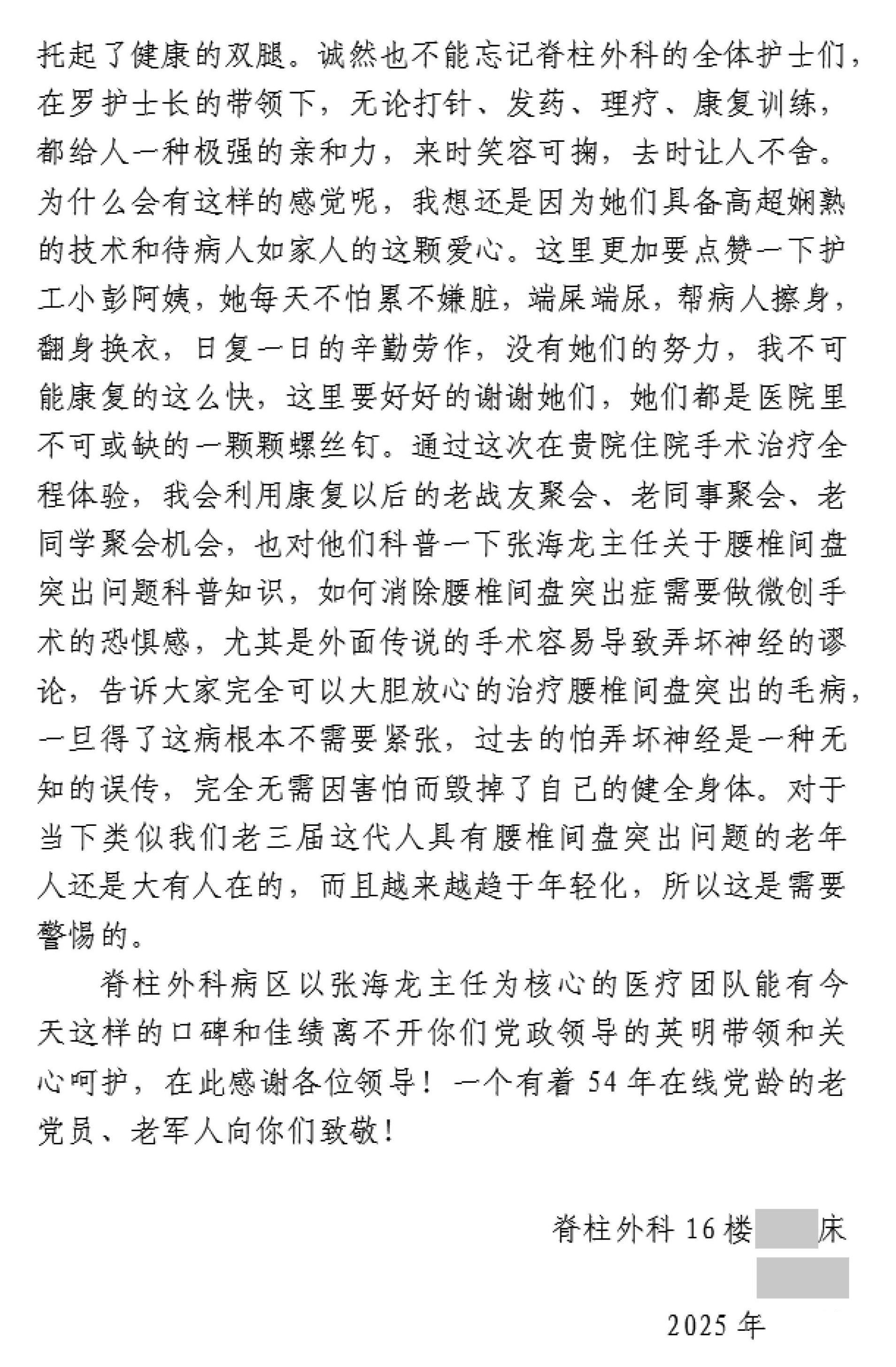 正因为自身曾受不实传言影响,拒绝手术达五年之久,重拾健康的L老伯表达了要成为十院脊柱外科“科普官”与“代言人”的强烈意愿——“通过这次在贵院住院手术治疗全程体验,我会利用康复以后的老战友、老同事、老同学聚会机会,也对他们科普一下关于腰椎间盘突出问题的知识,消除腰椎间盘突出症需要做微创手术的恐惧感,尤其是外面传说的手术容易导致弄坏神经的谬论……”