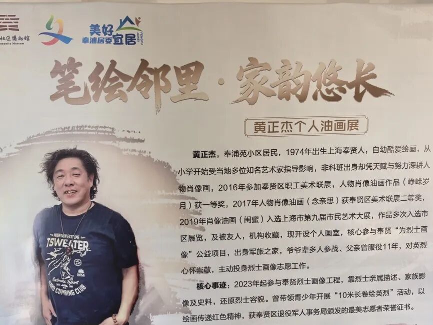 展 览 名 称 笔绘邻里·家韵悠长 黄正杰个人油画展 展 览 时 间 2025年12月15日开展 展 览 地 点 奉浦苑社区博物馆 上海市奉贤区奉浦街道国顺路218号 (奉浦苑小区架空层) 本期展览由奉浦苑居民、社区青年艺术家黄正杰匠心呈现,用细腻笔触定格小区居民的鲜活模样,用艺术语言讲述“家”的故事,更将新时代文明实践的内涵融入画作,让邻里温情与文明新风在社区间流转。 个人油画展 黄正杰,奉浦苑小区居民,1974年出生于上海奉贤,自幼酷爱绘画,从小学开始受当地多位知名艺术家指导影响,非科班出身却凭天赋与努力深耕人物肖像画,2016年参加奉贤区职工美术联展,人物肖像油画作品《峥嵘岁月》获一等奖,2017年人物肖像油画《念亲思》获奉贤区美术联展二等奖,2019年肖像油画《闺蜜》入选上海市第九届市民艺术大展,作品多次入选市区展览,以及被友人,机构收藏,现开设个人画室,核心参与奉贤“为烈士画像”公益项目,出身军旅之家,爷爷辈多人参战、父亲曾服役11年,对英烈心怀崇敬,主动投身烈士画像志愿工作。 核心事迹 2023年起参与奉贤烈士画像工程,靠烈士亲属描述、家族影像及史料,还原烈士容貌。曾带领青少年开展“10米长卷绘英烈”活动,以绘画传递红色精神,获奉贤区退役军人事务局颁发的最美志愿者荣誉证书。 展览亮点 本期展览的作品取材于社区里的生活日常,是新时代文明实践在社区落地生根的生动写照。黄正杰以独特的艺术视角,将邻里相处的温情、日常时光的暖意绘于画布之上。画面里既有夫妻相守的温情、一家人齐聚的欢愉,也有居民日常的鲜活模样、儿时记忆的珍贵瞬间。每一笔色彩都饱含对家园的热爱,每一幅画作都凝聚着对文明新风的赞颂,让“家”的温暖与文明的力量在艺术中交融共生。 展品预览 奉浦苑社区博物馆里,讲述着奉浦苑的故事,讲述着奉浦苑居民的故事。此次展览既是青年艺术家个人才华的展示,更是社区文化建设与新时代文明实践深度融合的生动实践。通过艺术作品搭建邻里交流的桥梁,进一步凝聚社区向心力,彰显党建引领下社区治理的人文温度。