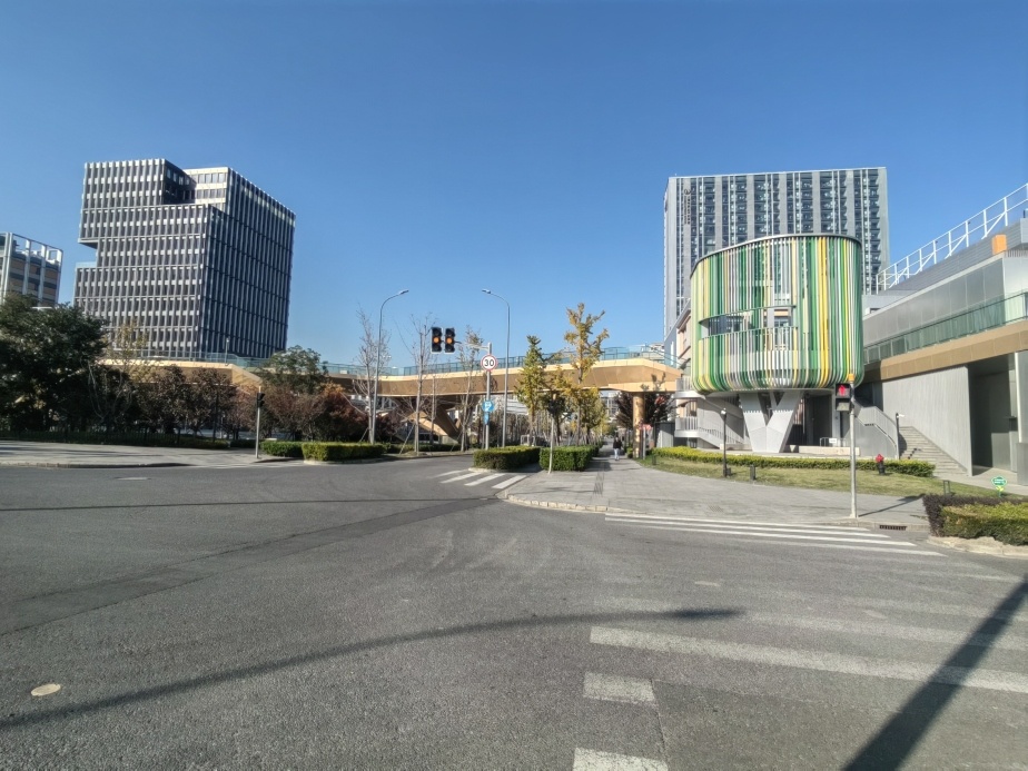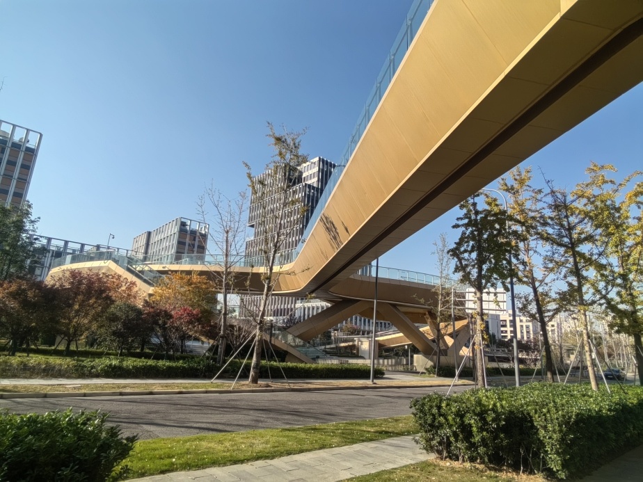 金鼎区域在慢行精品区创建中,利用多层行道树、多道绿化带的景观布局,自然区分车行道、非机动车道、人行道的通行空间,保障慢行通行路权。路口 “零高差” 的坡道设置也方便了非机动车、轮椅车通行。空中则设有二层连廊和步行天桥,跨越河道和道路,并延伸至建筑内。其中一座连廊跨越了西群河,东侧连接起申启路上的商办楼,西侧则连通了申涛路上的楼宇。