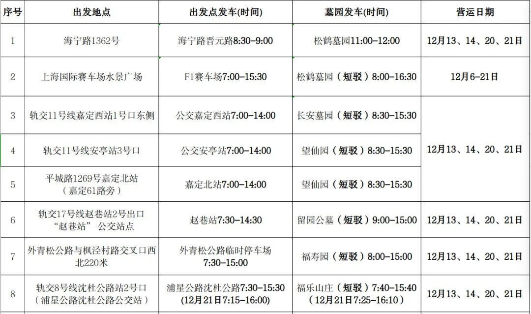 据市道运中心消息,为方便市民冬至期间祭扫,本市开通8条冬至定点扫墓班车,具体线路营运安排见下图。