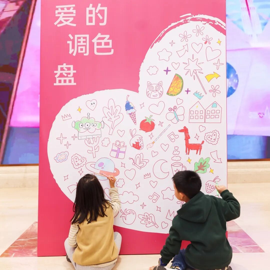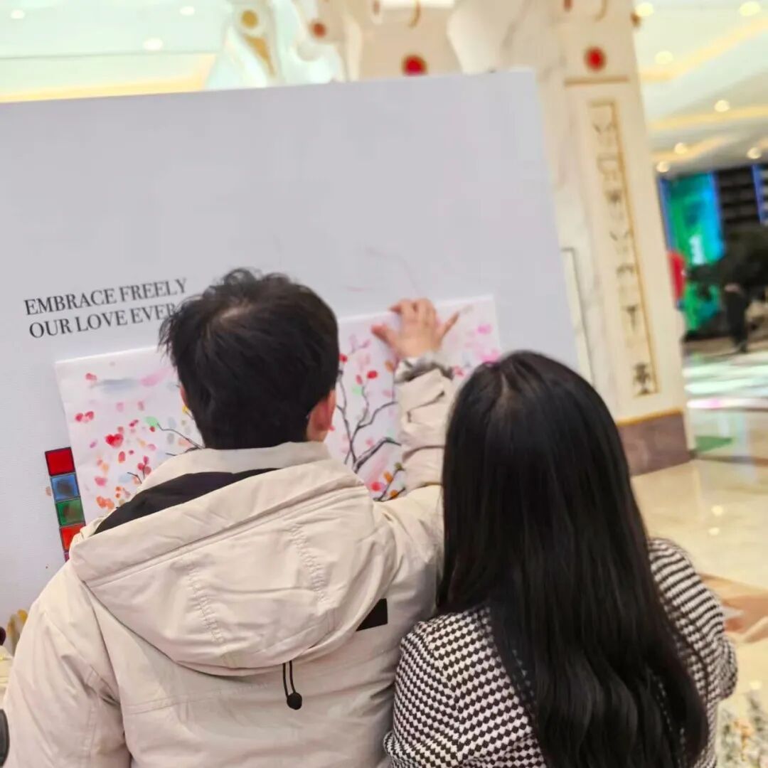 “用一生爱一人”爱心墙吸引不少群众打卡拍照。一对年轻的夫妻饶有兴致地对照婚龄条幅,打趣道:“今年我俩是纸婚,恭喜通关‘新手村’。”两人笑着看向后方的银婚、金婚、钻石婚,未来很长,请携手向前。互动区更是一片欢声笑语,孩子们用稚嫩的笔触为“家”填充色彩,情侣们拇指创作共同勾勒幸福的轮廓,这里成为留存温情记忆的城市空间。