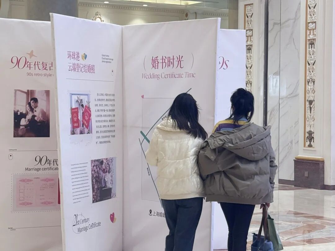 随着婚俗改革的深入推进,普陀区婚姻登记窗口不断创新服务场景。“普陀新增了环球云端登记点,258米高空见证爱情,太让人心动啦!”在宣传海报区前,情侣们一边交流,一边上网查询预约方式,工作人员则在一旁耐心指导,为他们提供独特而富有纪念意义的登记体验。