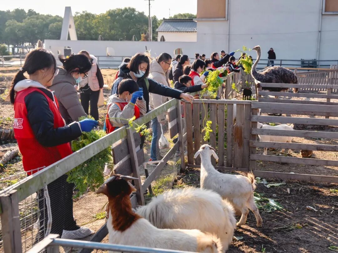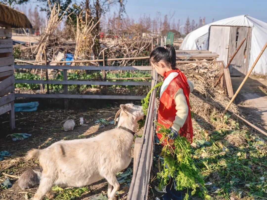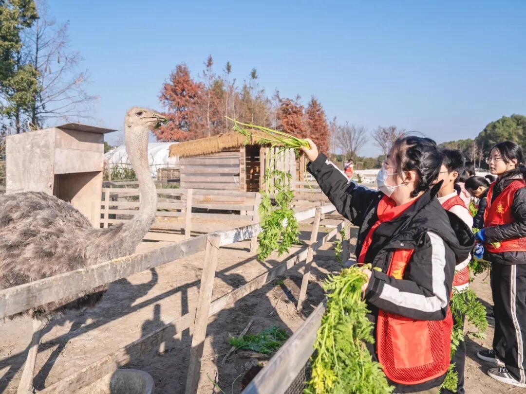 采收完毕,少年们把沾泥的胡萝卜缨拢入筐,跟随饲养员来到羊圈与鸵鸟栏。嫩绿叶片撒落食槽,羊羔轻嗅,鸵鸟伸颈轻啄,咀嚼声沙沙作响;孩子们凑近看,忍不住“哇”出声:原来边角料也能这么香!