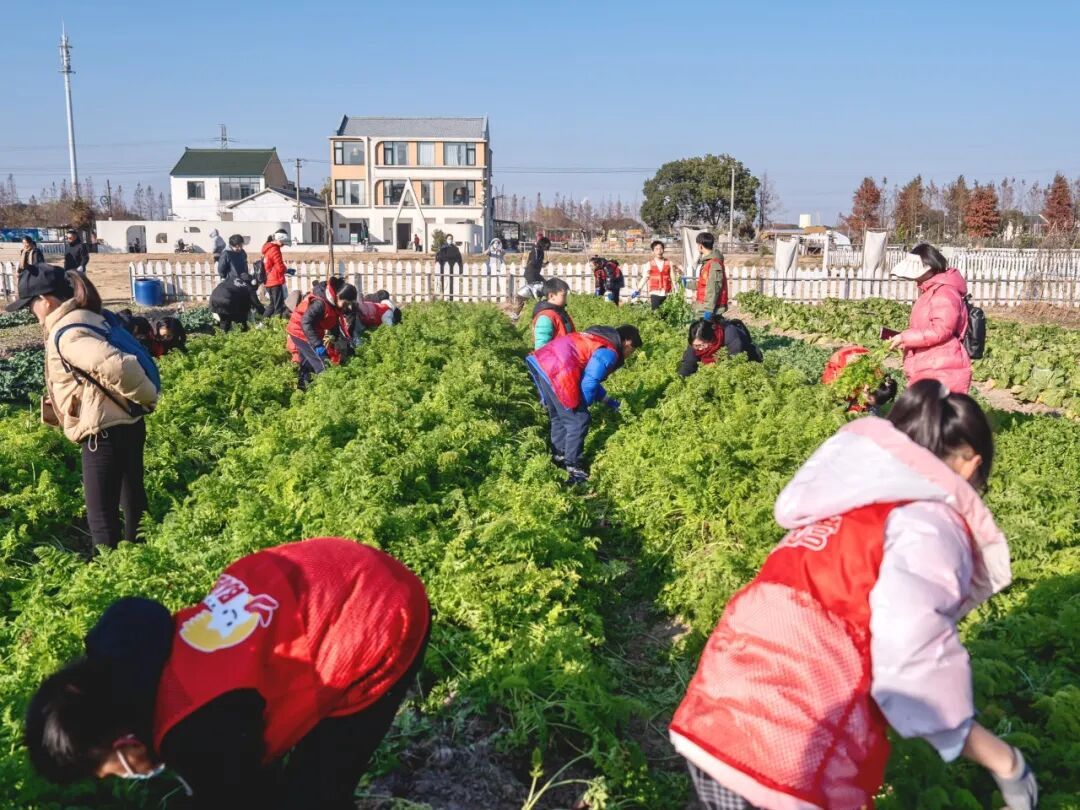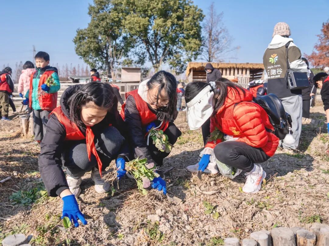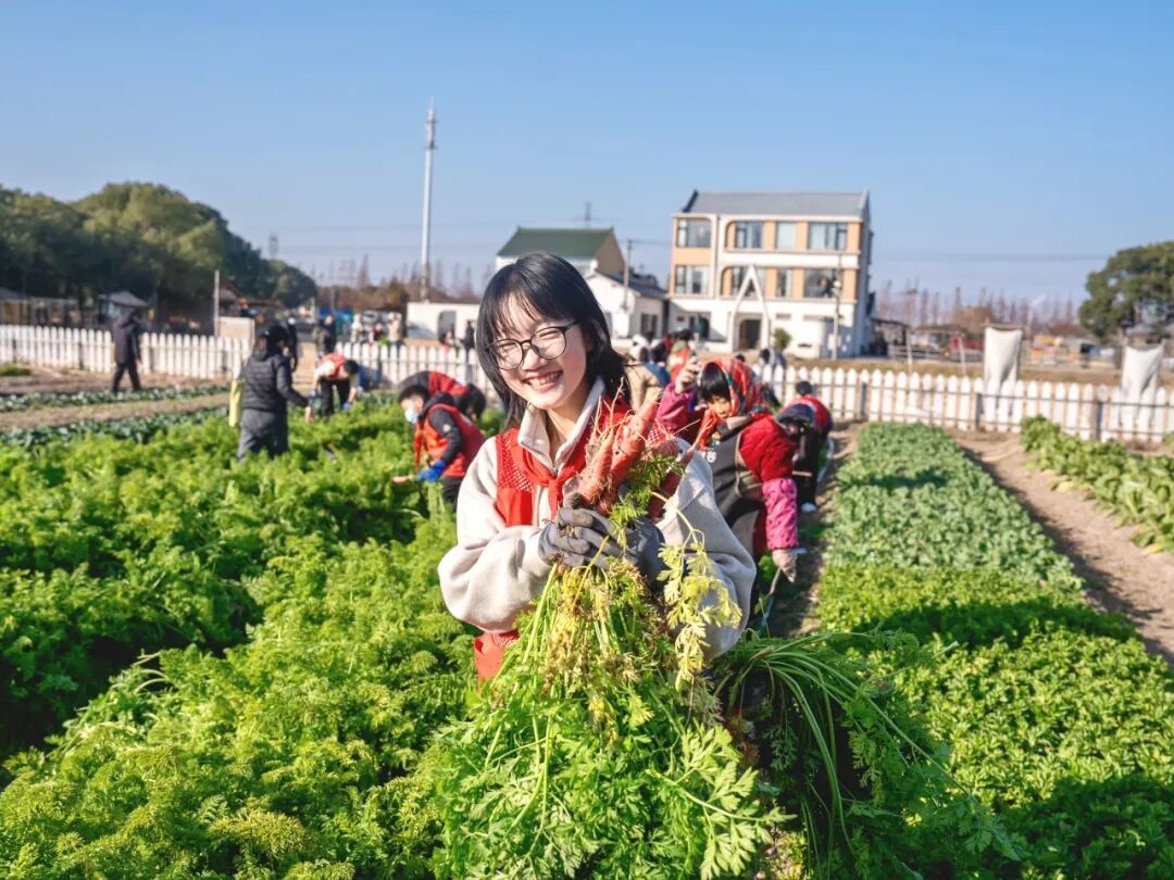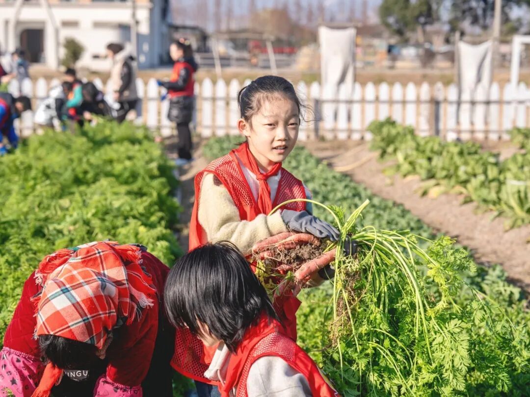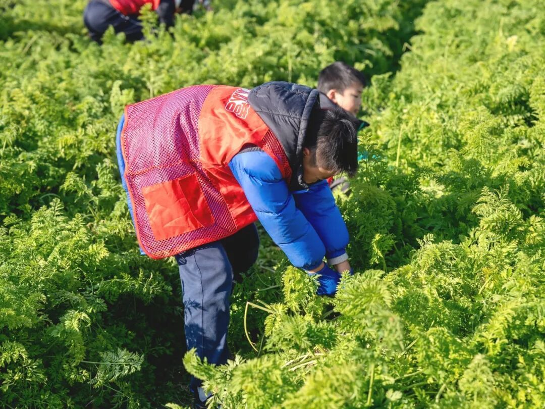 农耕环节告一段落,少年们移至胡萝卜种植区。阿姨示范松土、拔取的标准动作后,大家有序进行采收:左手握叶,右手稳拔,胡萝卜脱泥而出,现场的欢笑声随收获同步升温。