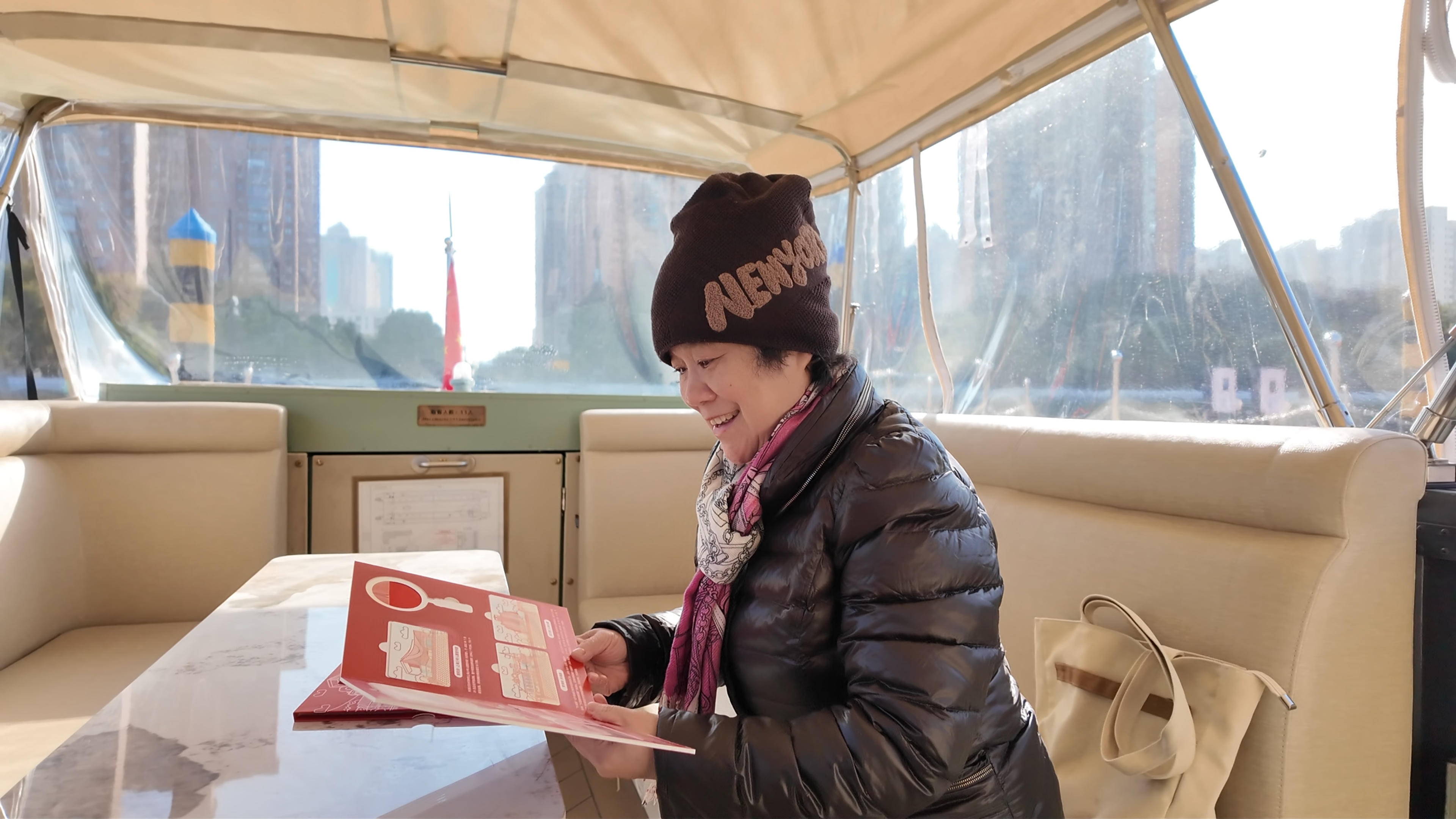 登上福利航班的市民黄河与陈月凤夫妇,收到了一份意外惊喜——三周年纪念册。纪念册内五张卡片以红、蓝色简约线条,勾勒出苏州河沿线代表性航段与建筑,展现上海明媚的城市风貌。更巧妙的是,当附赠的红色放大镜掠过卡片,隐藏的人物图案便跃然浮现,让陈月凤爱不释手:“这些卡片不仅好看,还能作为交通卡使用,很有纪念意义。”