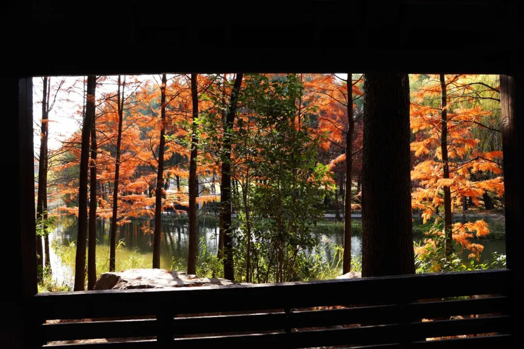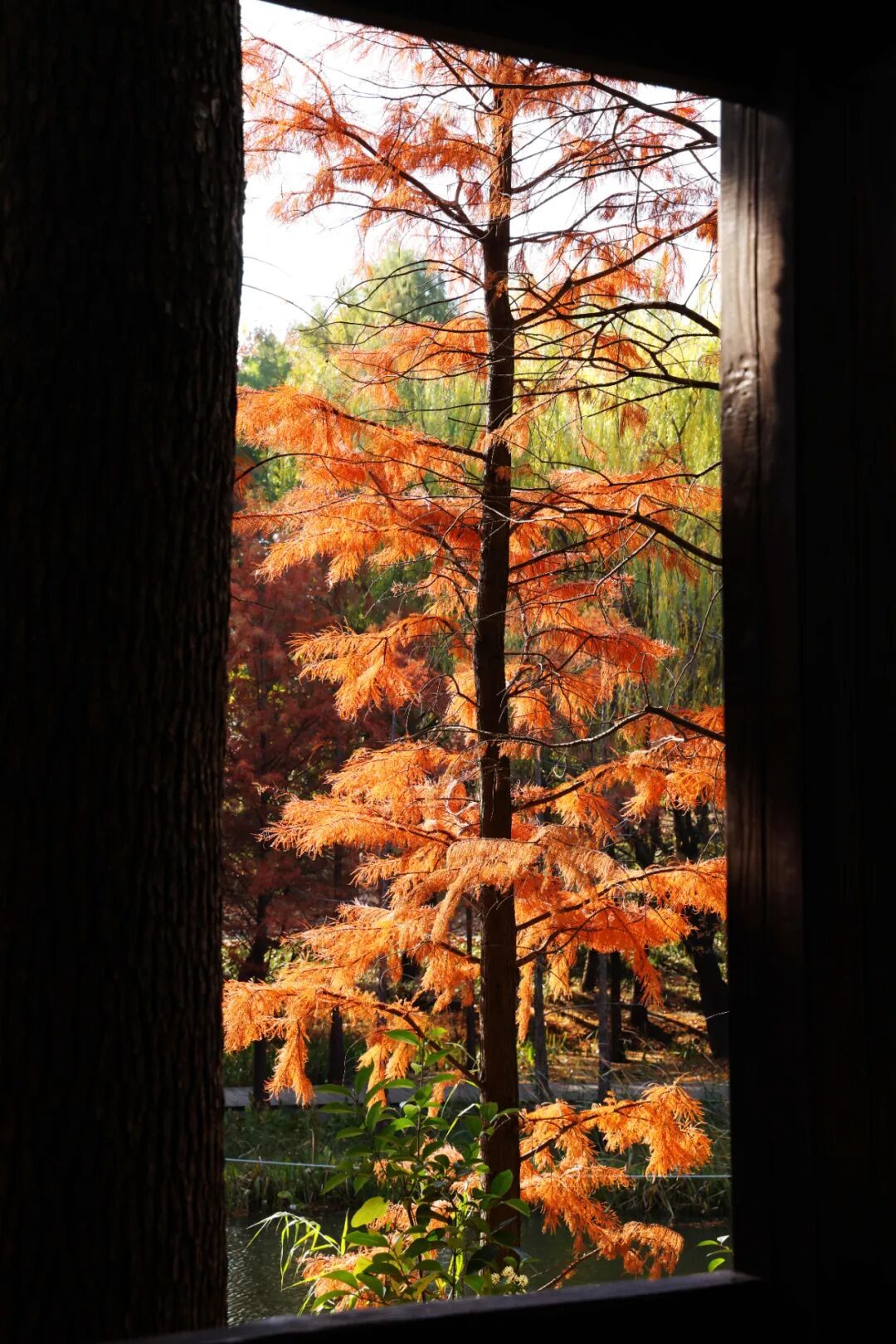 沿着木桥行走红杉、水面与垂柳被巧妙地“框”进视野阳光洒落其间色彩在绿与橙之间流转这些不经意的构成让自然景色多了一份精致