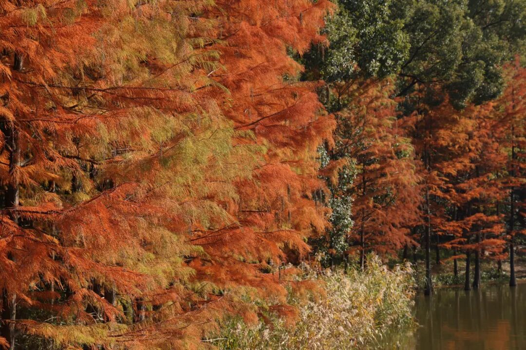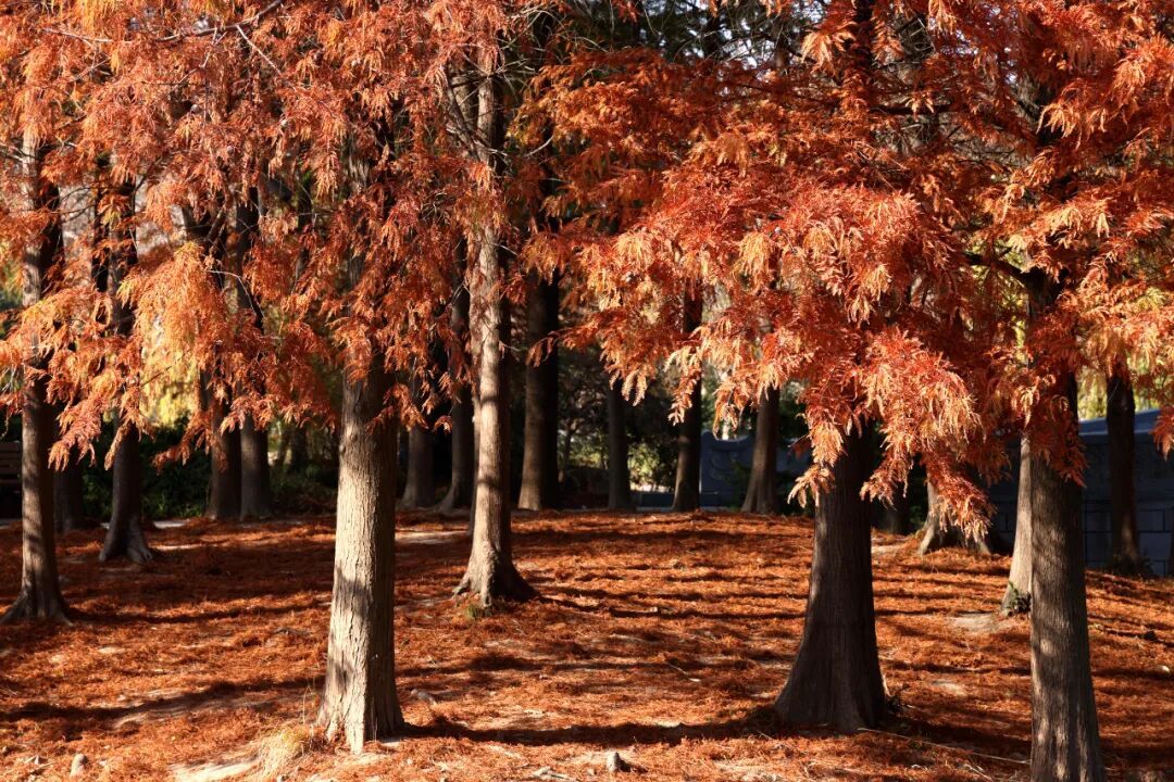 阳光穿过高大的红杉林橙红色的树冠在光影中愈发饱满为闵行文化公园铺下一层温柔而明亮的底色