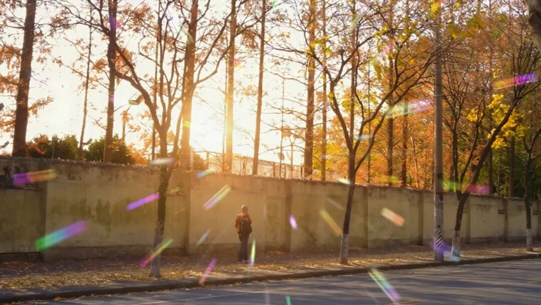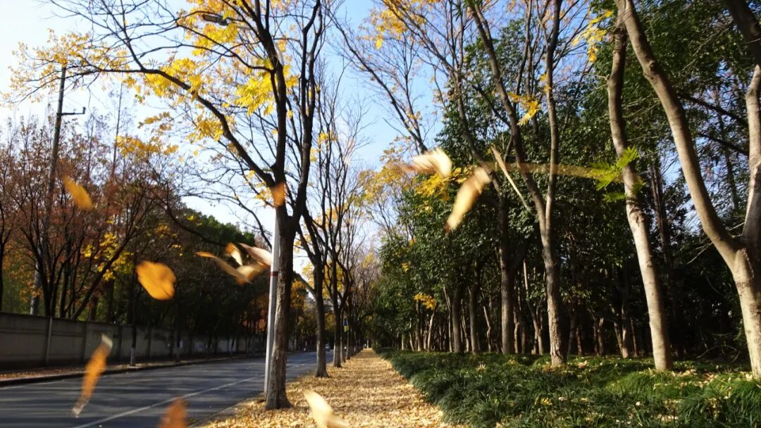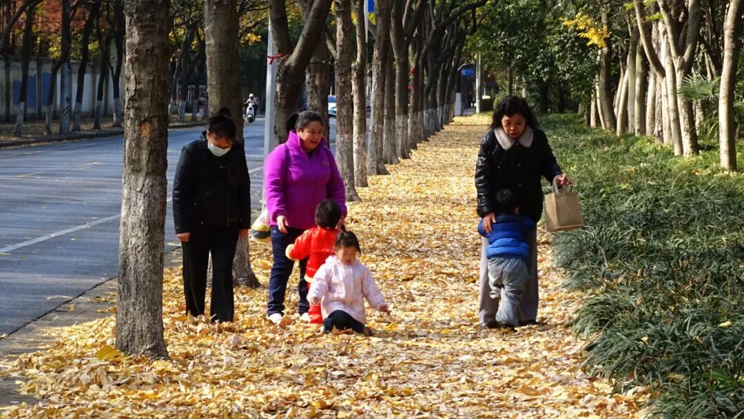 街道被栾树的落叶染成金黄金片飞起,脚步停留祖孙的笑声与行人的身影让这条道路多了一抹生气