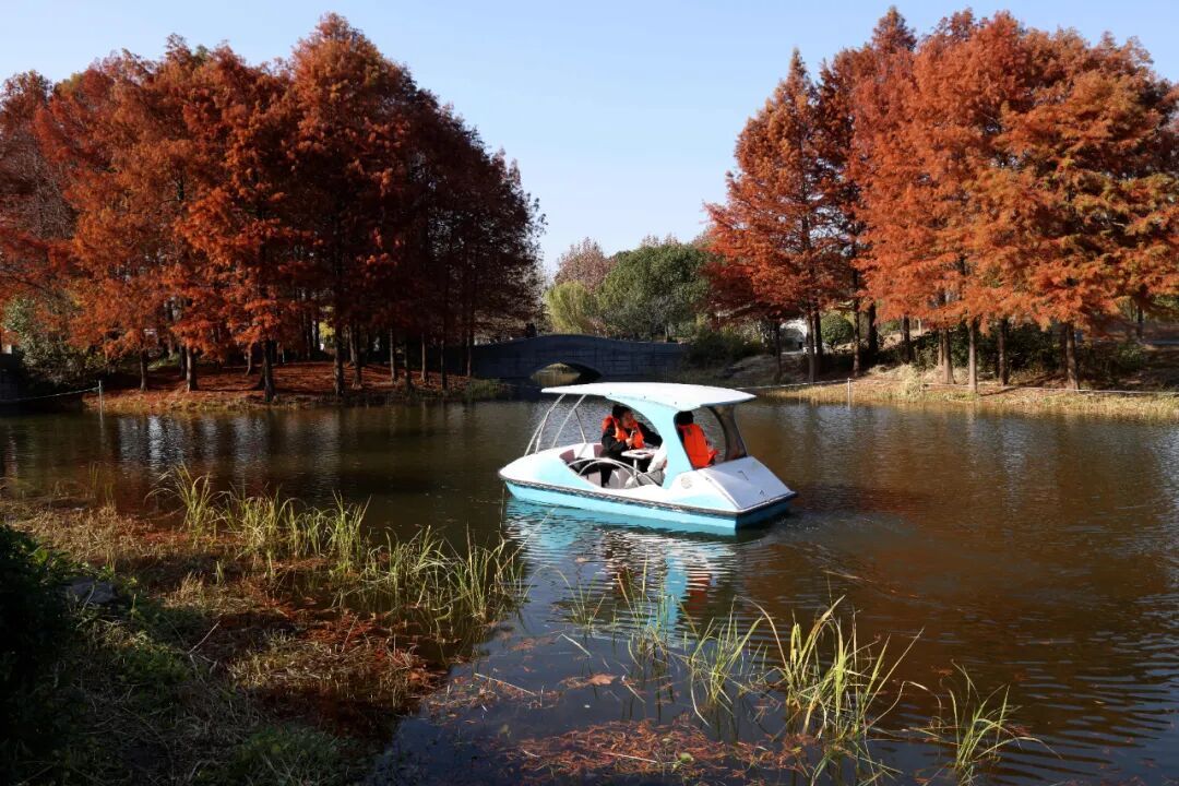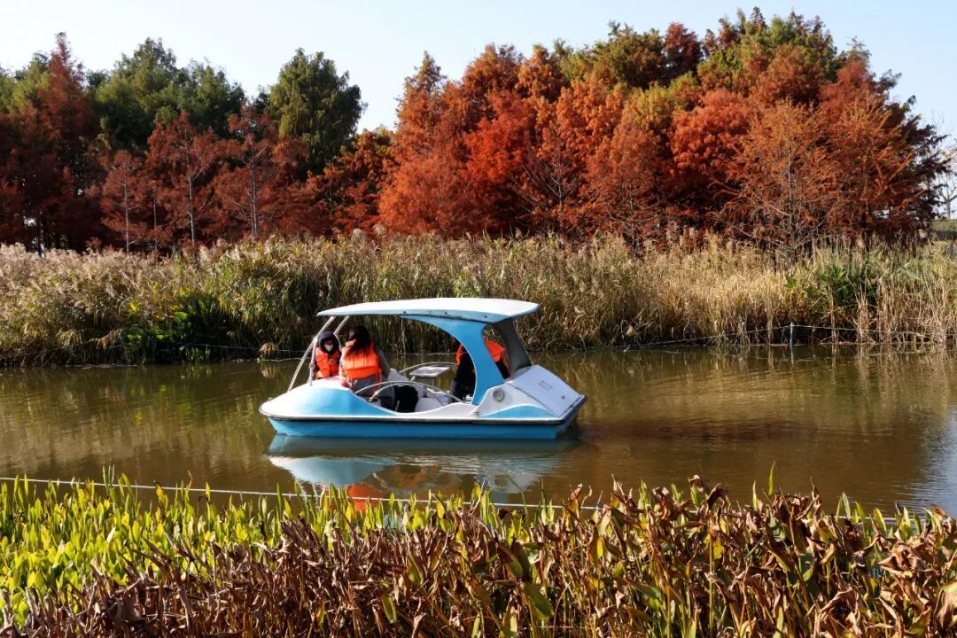 人行道旁,水杉整齐排列与湖水、芦苇和身后的红杉林共同构造一条开放的闵行风景线行走、休息、泛舟,生活的不同状态在同一片空间里自然发生阳光恰当好处