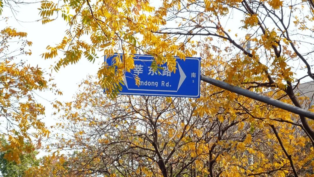 蓝色路牌隐在枝叶之间黄绿相间铺满画面这道城市坐标被秋冬色包围