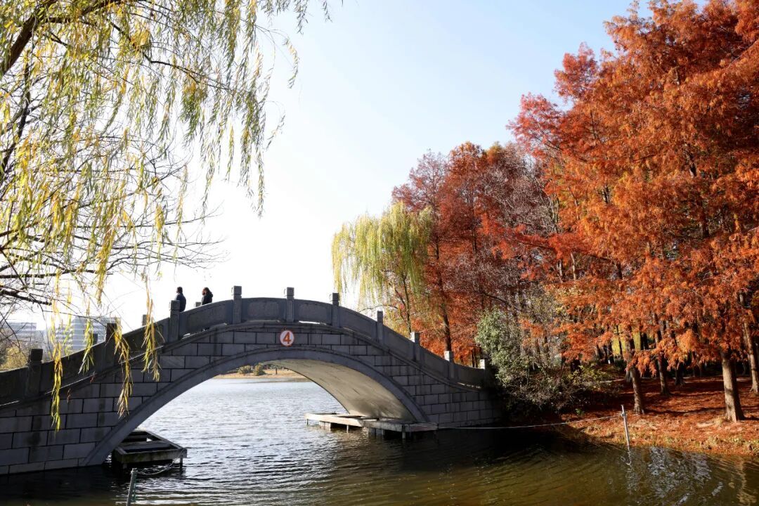 桥边交错的红与绿林间蜿蜒的小路共同构成莘庄公园的静谧一角在这里,色彩不张扬却足够耐看