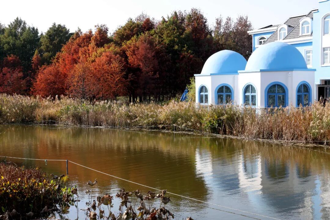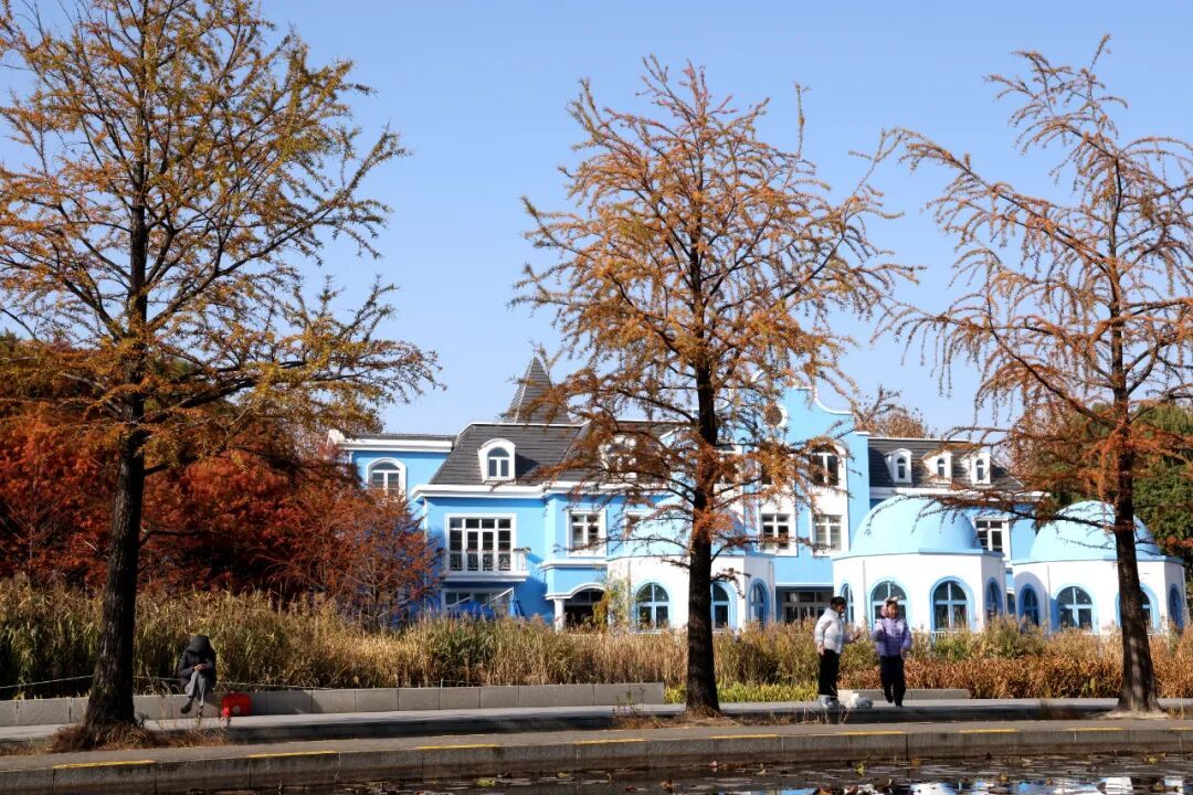 蓝色小屋点缀在湖畔与红杉、芦苇、水杉和枯荷形成鲜明对比有人停下脚步欣赏美景有人低头品味摄影作品时间在这里显得格外从容湖水与色彩一起把节奏放慢