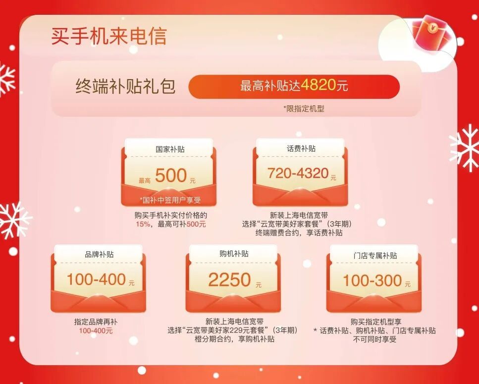 消费者在上海电信江苏路营业厅购买手机,终端补贴礼包最高可达4820元。此次优惠涵盖国家补贴、合约话费补贴、品牌厂商让利、合约购机补贴及门店专享补贴,形成多层次的实惠叠加。对于有换机需求的市民而言,当前是一个较为合适的购机窗口期。活动具体细则及适用机型可前往营业厅咨询了解。