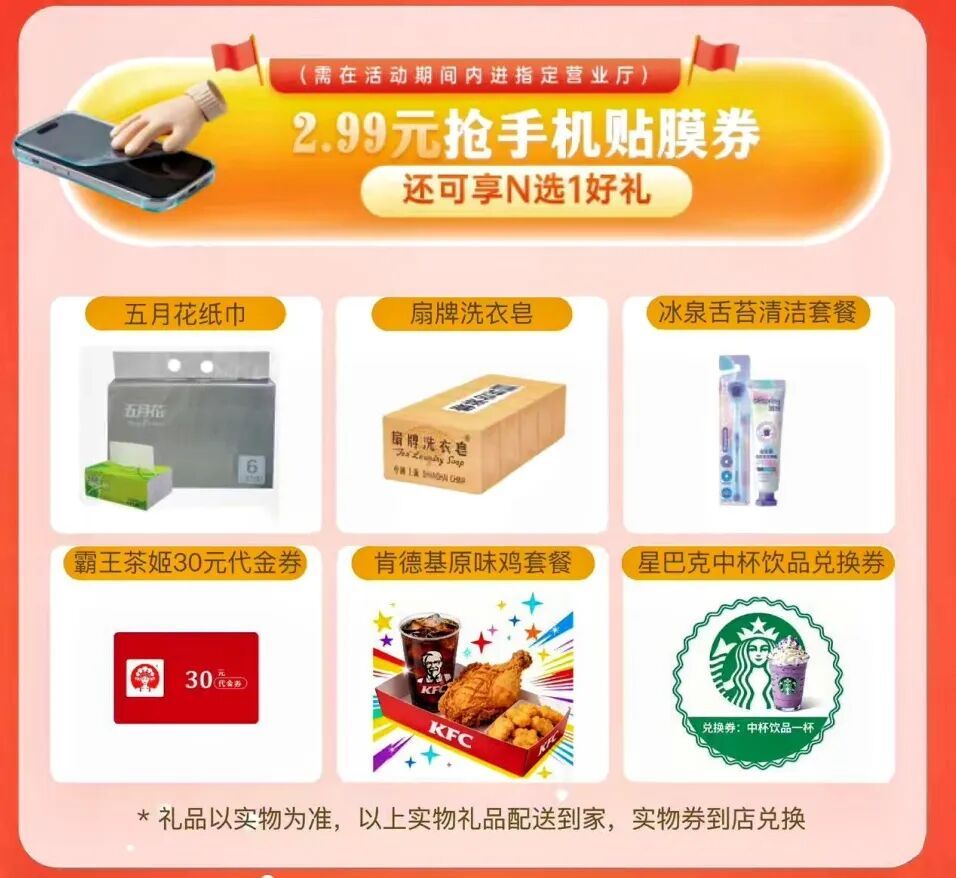 活动期间,消费者可通过扫描下方二维码,购买2.99元入场券。凭券到店可享手机贴膜服务,并可从六款礼品中任选其一领取。礼品数量有限,先到先得。