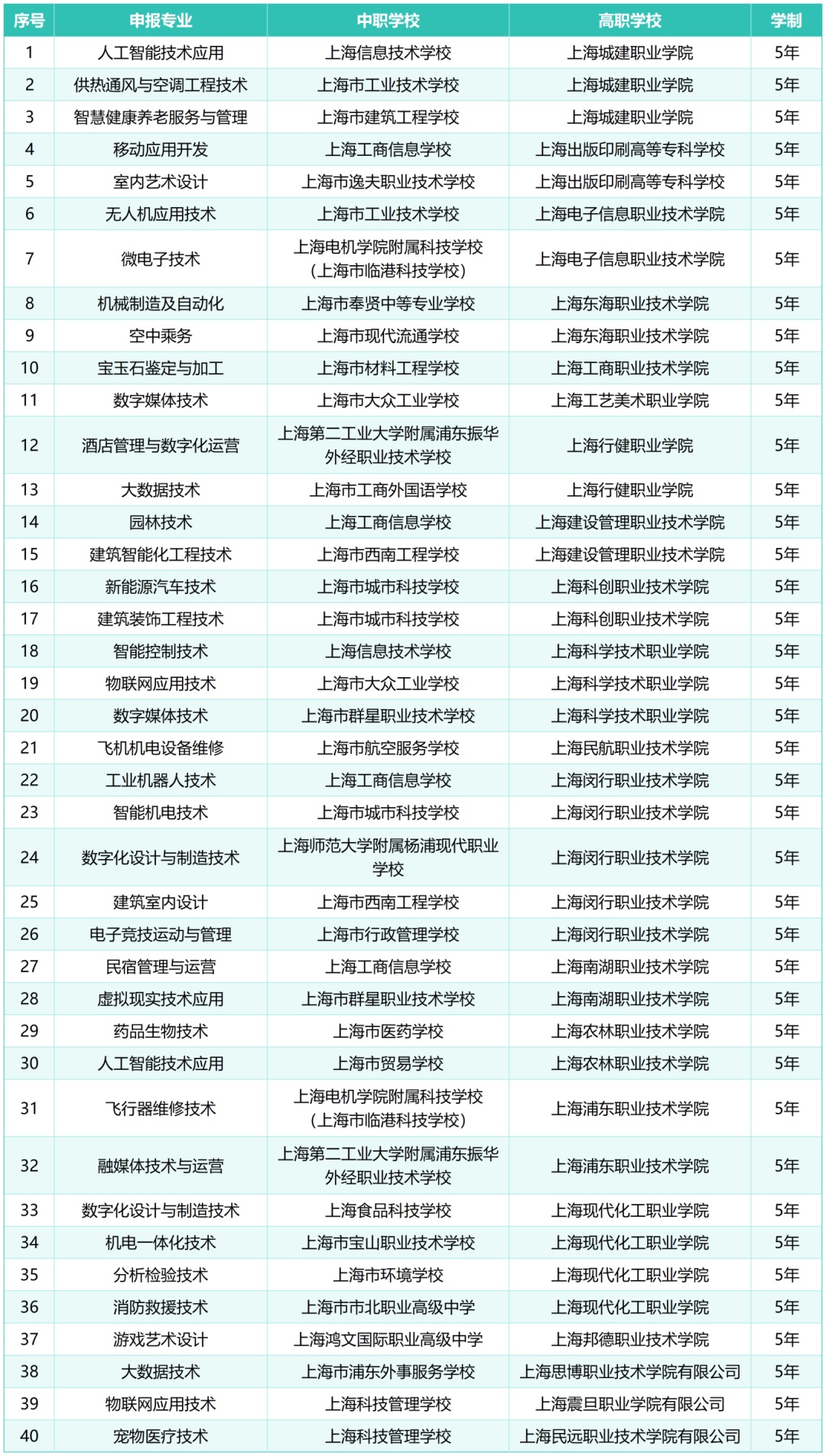 根据《上海市教育委员会关于继续开展中高职教育贯通培养模式试点工作的通知》和《上海市教育委员会关于继续开展中高职教育贯通培养模式试点工作的补充通知》,经学校申报、专家评议及市教委核定,同意2026年增设上海信息技术学校与上海城建职业学院联合举办的人工智能技术应用等40个中高职教育贯通培养模式专业。学生学籍管理和收费标准按相应规定执行,前3年按中职校有关规定管理,高职阶段按高职院校有关规定管理。一起来看——