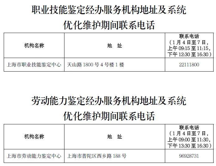 根据系统优化需要,本市人社信息系统将于2026年1月1日(周四)20时至2026年1月7日(周三)24时进行优化维护升级。届时,本市人社柜面经办系统、上海市人力资源和社会保障局门户网站、上海市人力资源和社会保障局自助经办系统,“一网通办”PC端、“随申办”移动端、社区事务受理系统等平台上的人社业务,以及全国人力资源和社会保障政务服务平台、国家社会保险公共服务平台等上海端业务将暂停服务。 温馨提示:2026年1月8日0时,人社业务全面恢复办理。对于近期有业务办理需求的企业群众,请合理安排,提前错峰办理,由此带来的不便,敬请谅解。服务暂停期间如需帮助,您可前往或致电各区社保分中心、区就业促进中心、市职业技能鉴定中心、市劳动能力鉴定中心等具体业务经办服务机构,或致电12333咨询。 上海市大数据中心信息化服务第三分中心 2025年12月15日 资料:上海人力资源和社会保障 编辑:沈悦 点击下方了解更多 普陀 你好 | 童趣满滑梯,稚声裹绿荫 “共享漂流瓶”漂遍社区,解锁邻里温情新密码 一楼一特色,绘就家门口的“文明风景线” 普陀区数字公共服务生态共建成果发布 苏州河游船三周年庆,全航段6折共赏冬日水岸
