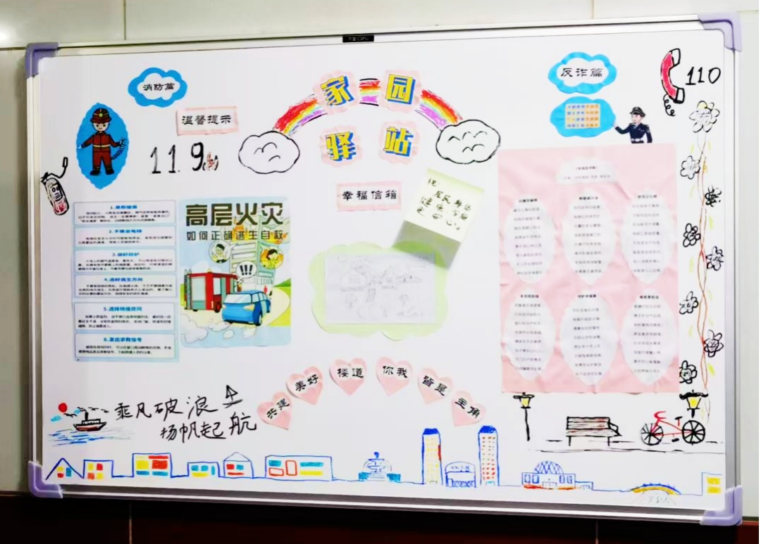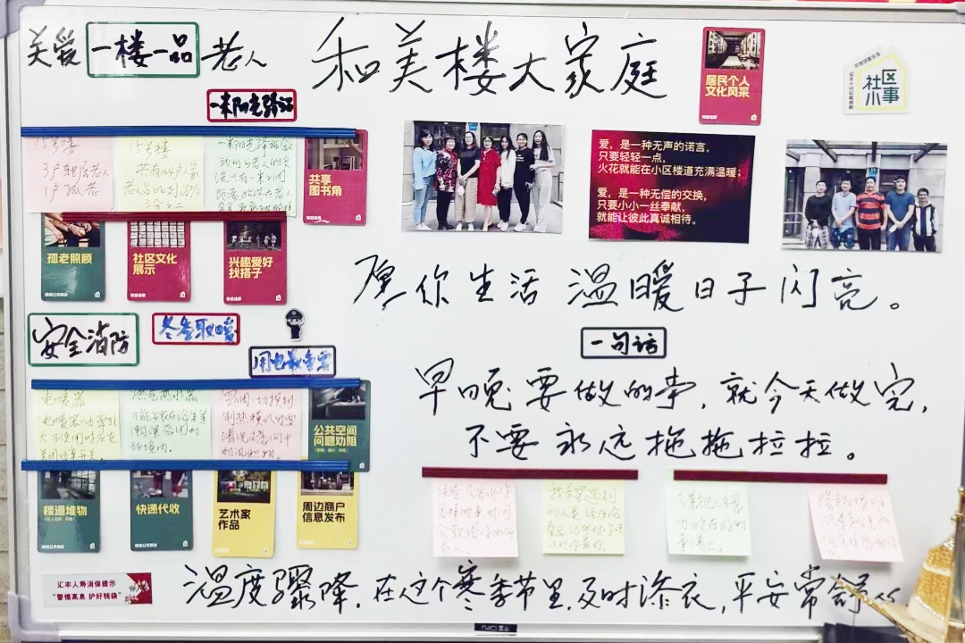万里雅筑“和美楼”已开展4期公告栏,创作灵感源于楼内“老中青”三代社区居民,他们通过协商共议,聚焦10多种主题开展绘制并形成“漂流”互动机制。内容包括党建引领志愿服务、一楼一品关爱老人、居委会物业共治社区、安全消防共查共治、家常菜烹饪交流、天气预报信息告知、便民信息共享、读书心得交流等。
