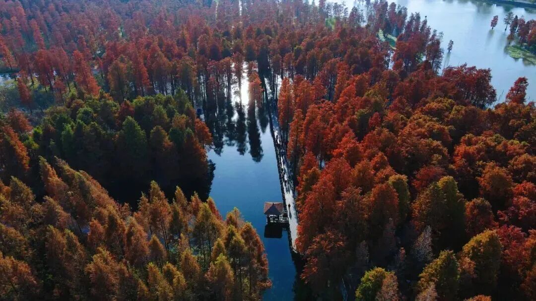 如果说水是青浦的血脉,那么林就是它的绿肺。这片绵延的绿色,既是屏障,也是福祉。沿太浦河、拦路港两岸,一条“蓝色珠链”贯穿南北,青西郊野公园恰似链上最璀璨的“绿宝石”。园内近5000亩的水上森林,是上海独有的生态景观。池杉林立、鹭鸟栖息,林、水、田、湖、草在此交融共生,构成重要的生态涵养林,每一帧风景都在讲述着生命演替的故事。