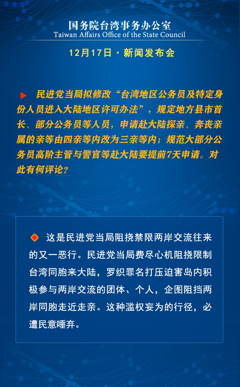 国台办:民进党当局滥权妄为、阻挠禁限两岸交流往来,必遭民意唾弃
