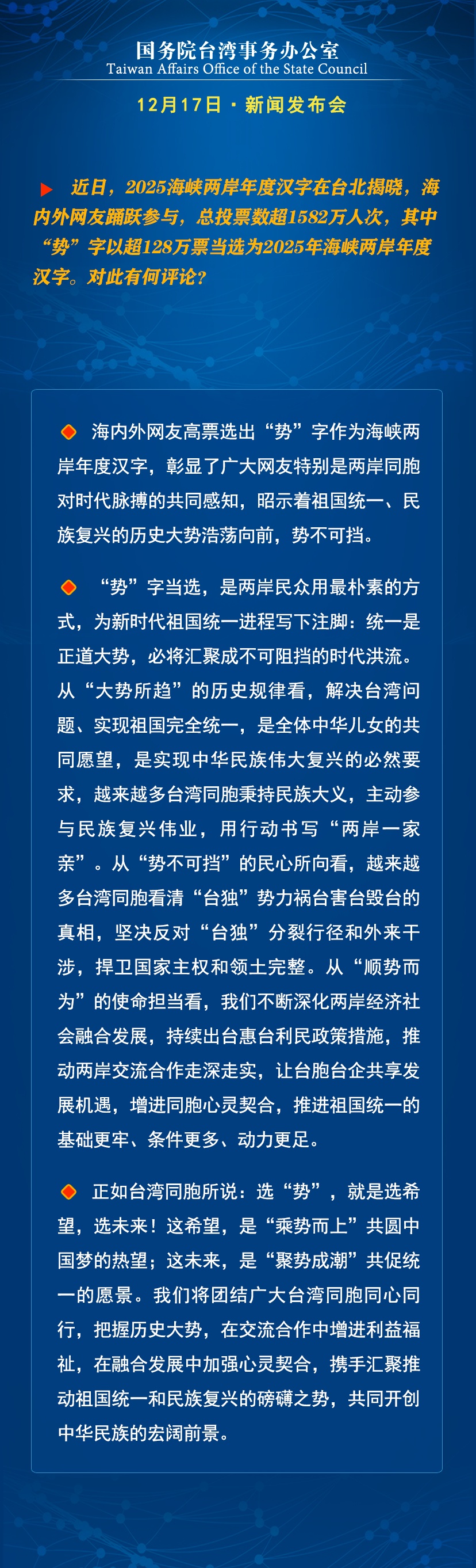 “势”字当选两岸年度汉字,国台办:统一是正道大势,必将汇聚成不可阻挡的时代洪流