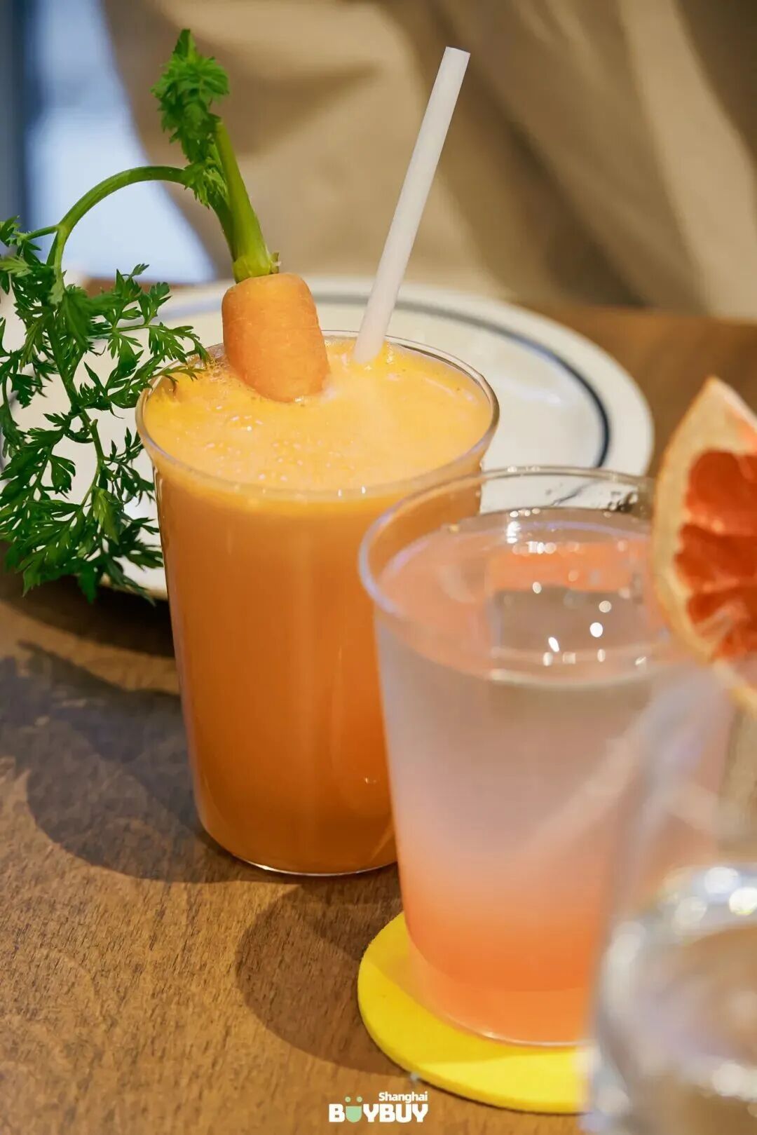 鲜榨胡萝卜汁里真的有一根小小的胡萝卜做装饰!两杯果汁喝下去都是很健康的味道,好像真的吃到了新鲜的蔬菜和水果!