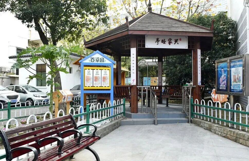 紧邻百草园的“家风亭”,是空间里最具文化温度的角落。亭内展示着由居民共同商议、书写的家风家训。不仅传递着社区的文明底色,也成为长者们日常歇脚、聊天、品茶的温馨“歇心角”,让优良家风在闲话家常中悄然流淌,筑牢社区文明根基。
