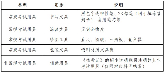 考生仅可携带本人《准考证》、有效居民身份证等证件及符合规定的考试用品(如黑色字迹签字笔、铅笔等)及《准考证》上招生单位说明栏目注明的可携带的用具进入考场(具体见下表)。