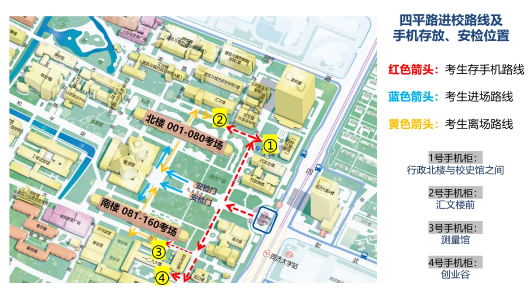 4. 考生入场、出场期间,四平路1239号门车辆禁行,持有效进校证车辆可从赤峰路50号、赤峰路200号、国康路11号、国康路99号门出入;校外公务来访车辆从预约指定校门出入;