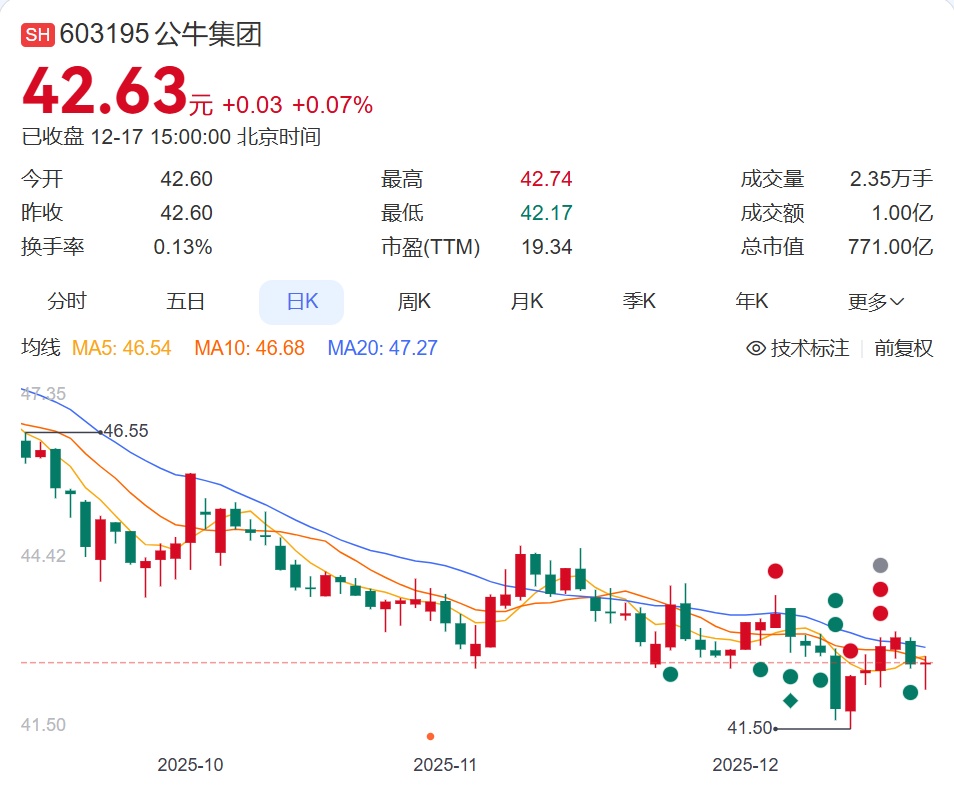 截至12月17日收盘,公牛集团股价报42.63元,年内跌超12%,总市值771亿元。
