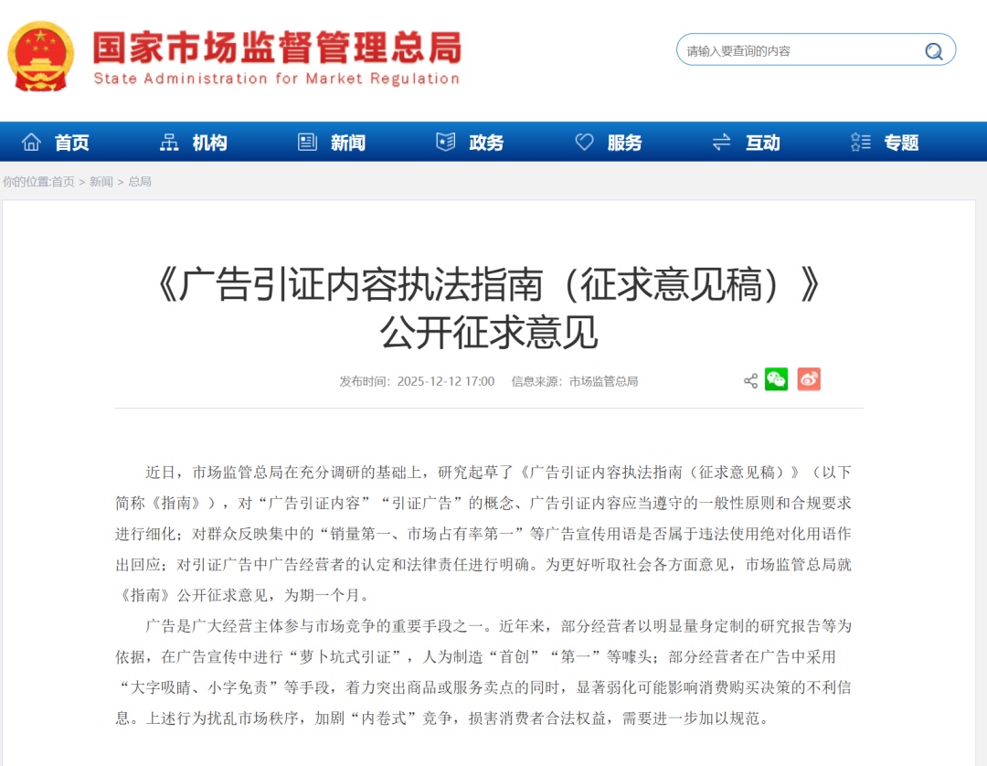 12月12日,市场监管总局就《广告引证内容执法指南(征求意见稿)》公开征求意见。